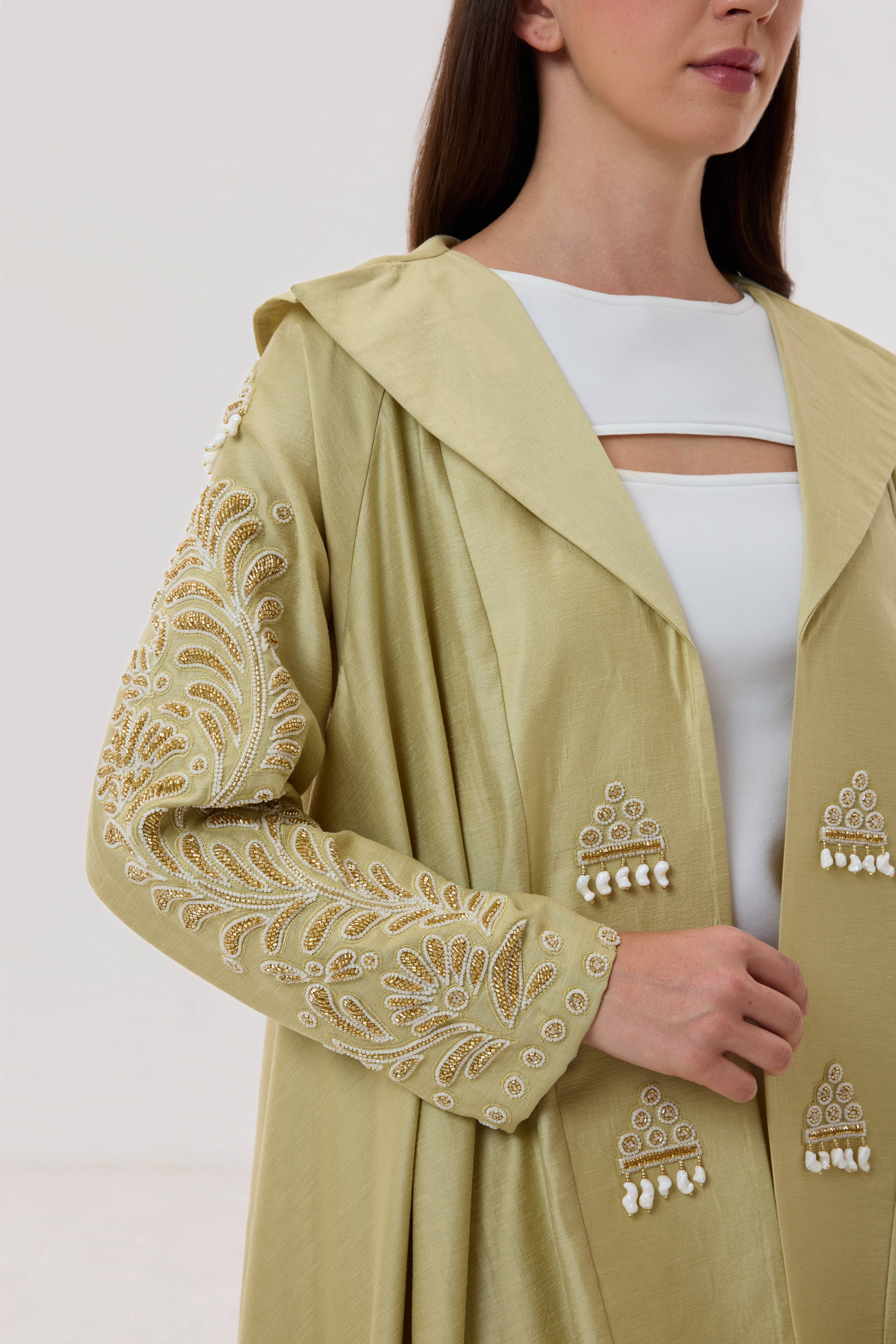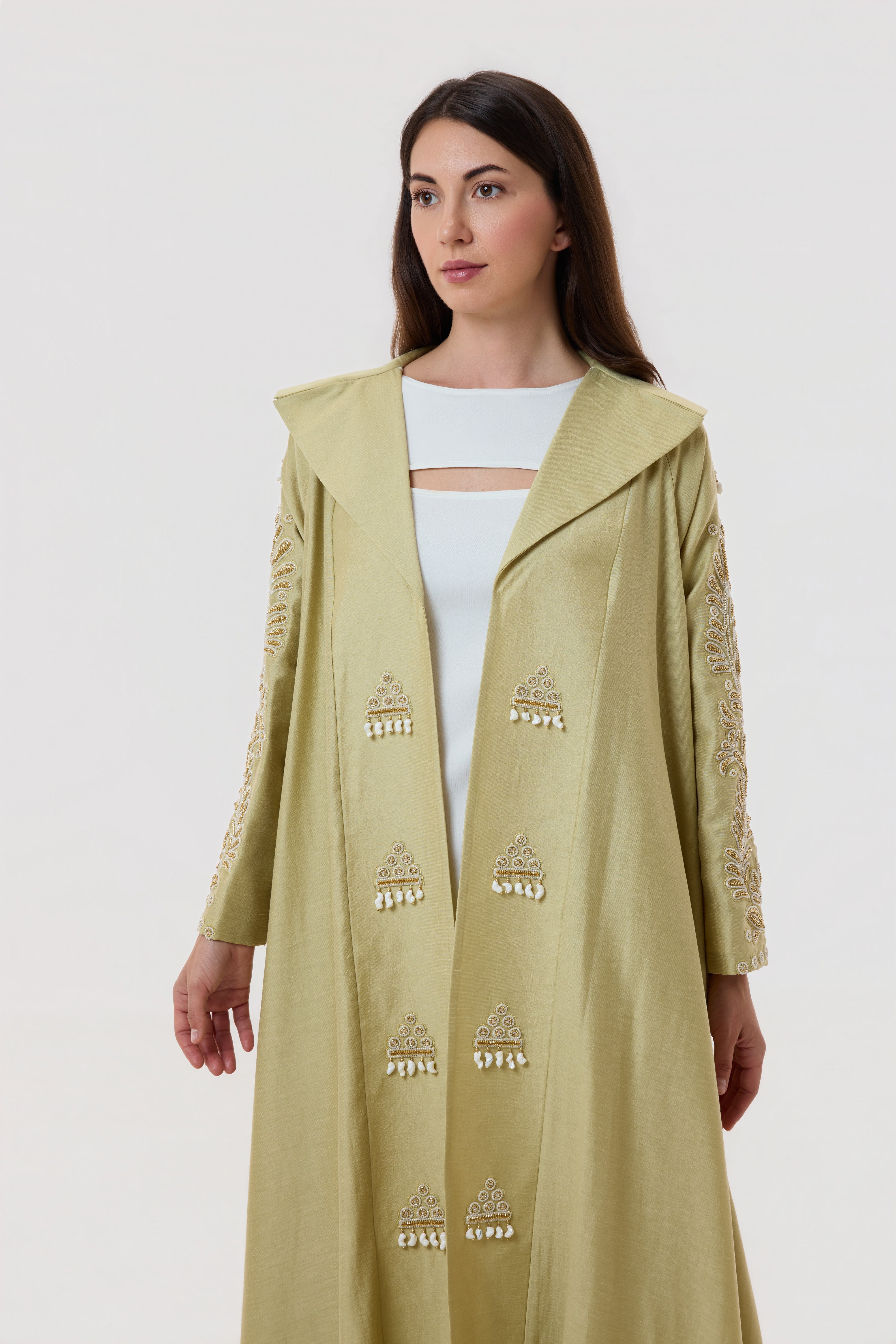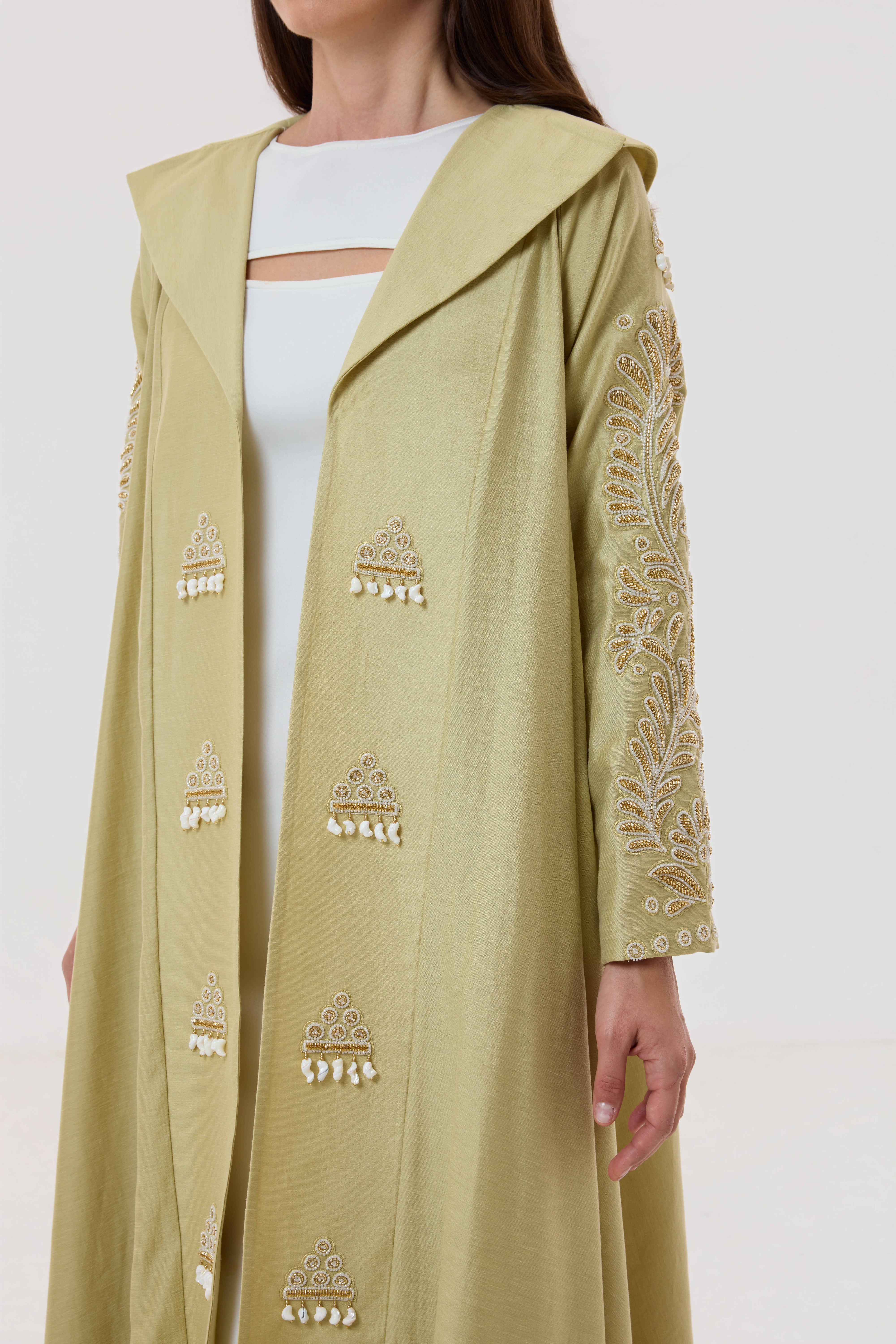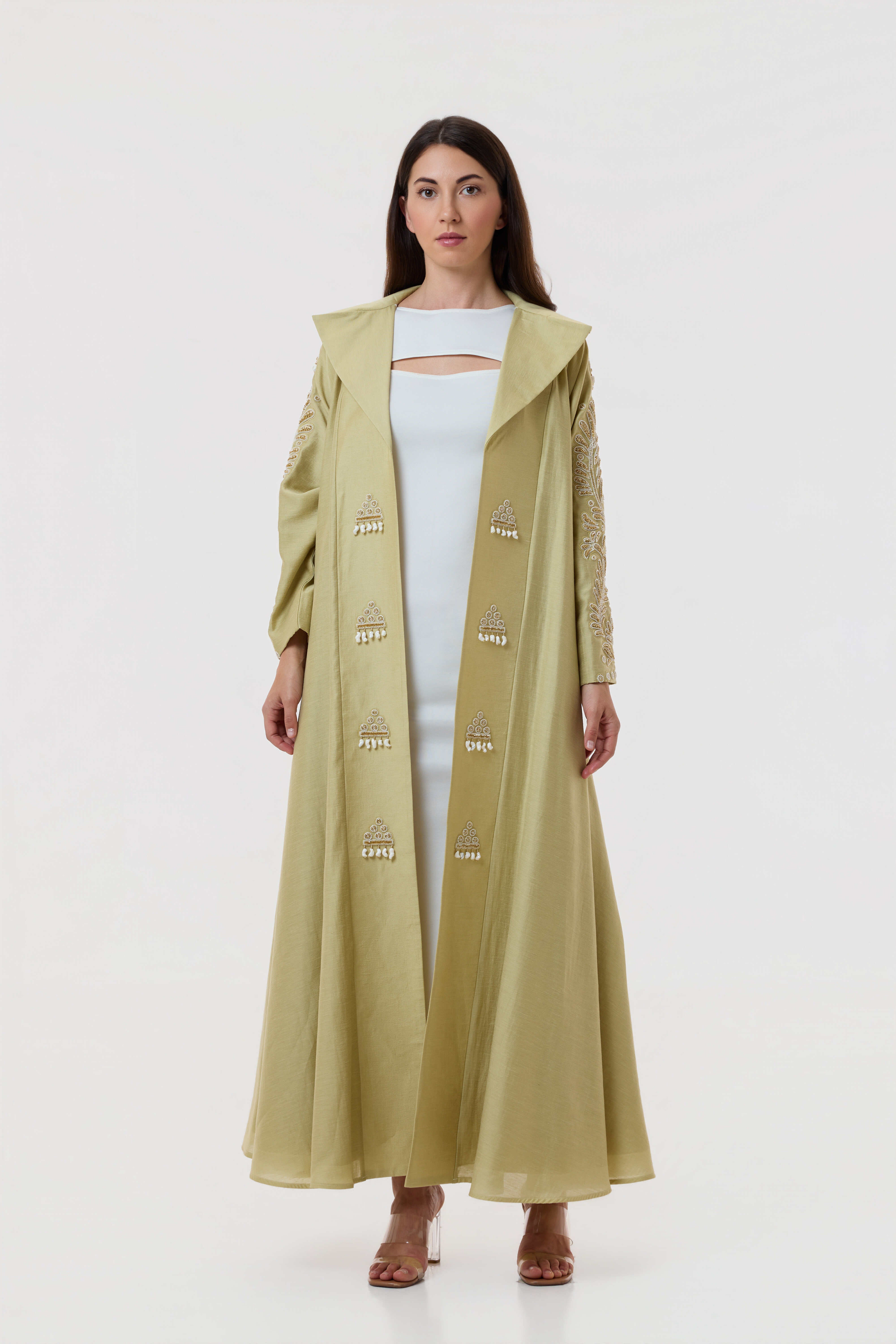 An elegant event abaya made from rich green silk, adorned with hand-embroidered greenery and gentle shell embellishments for timeless sophistication.