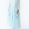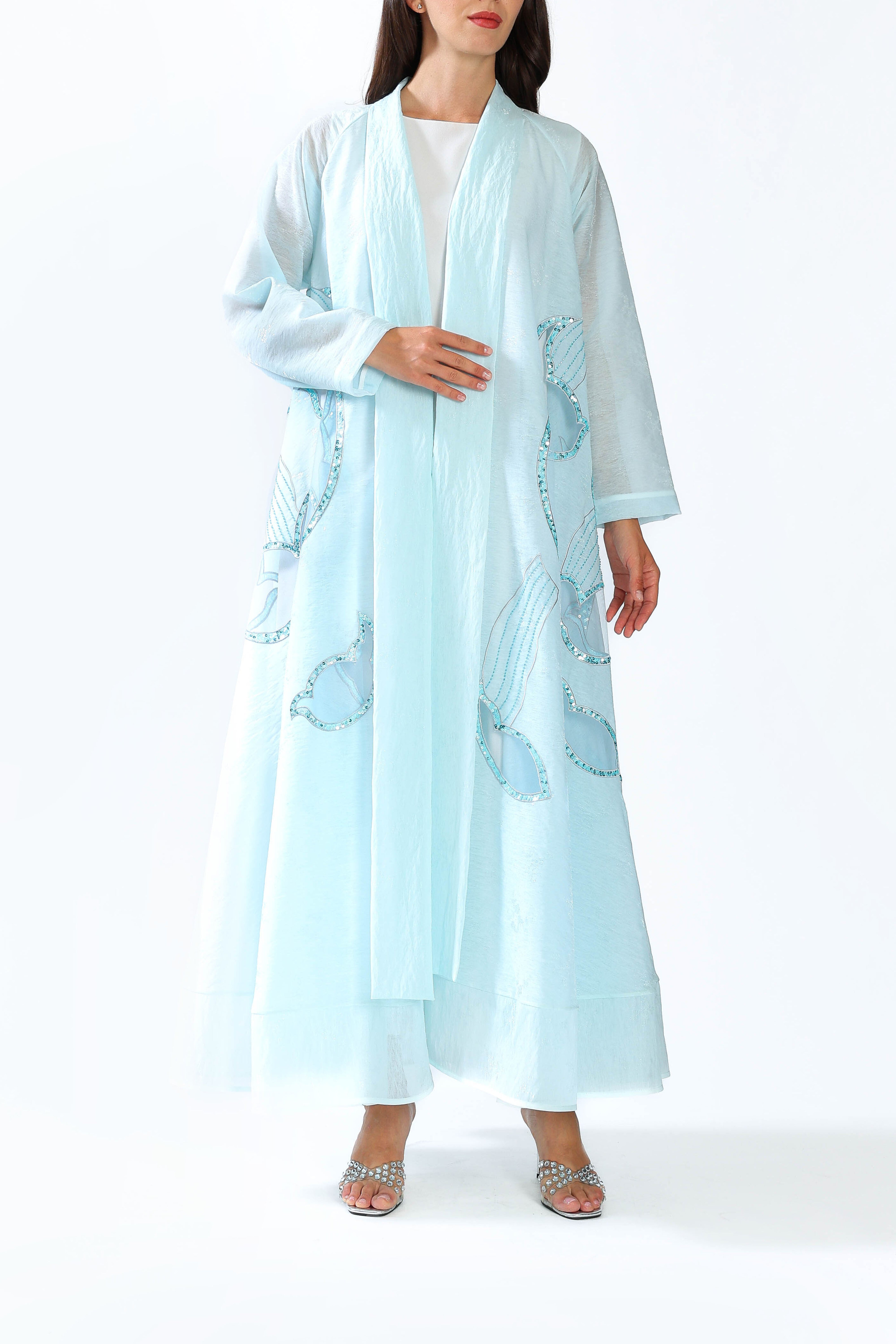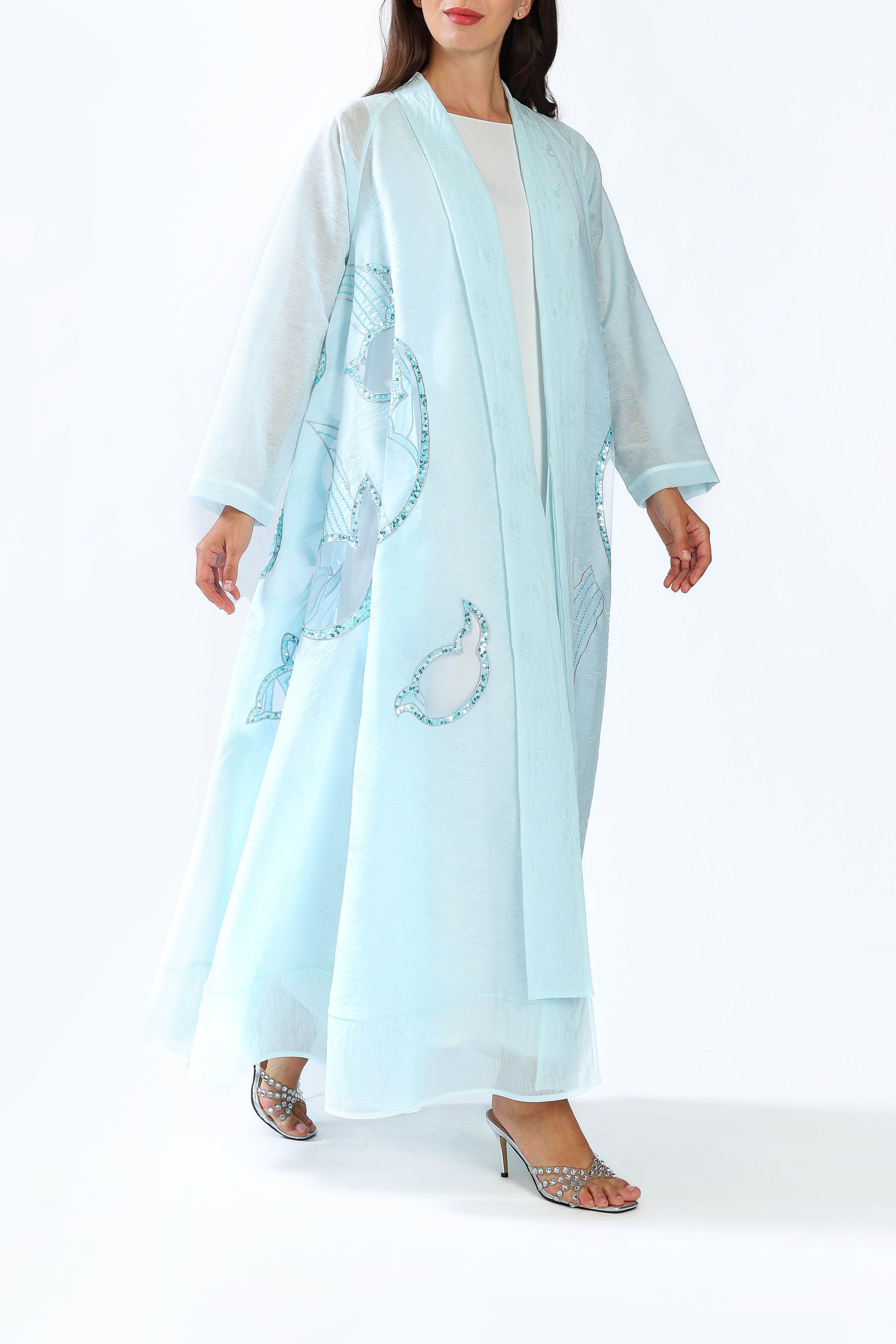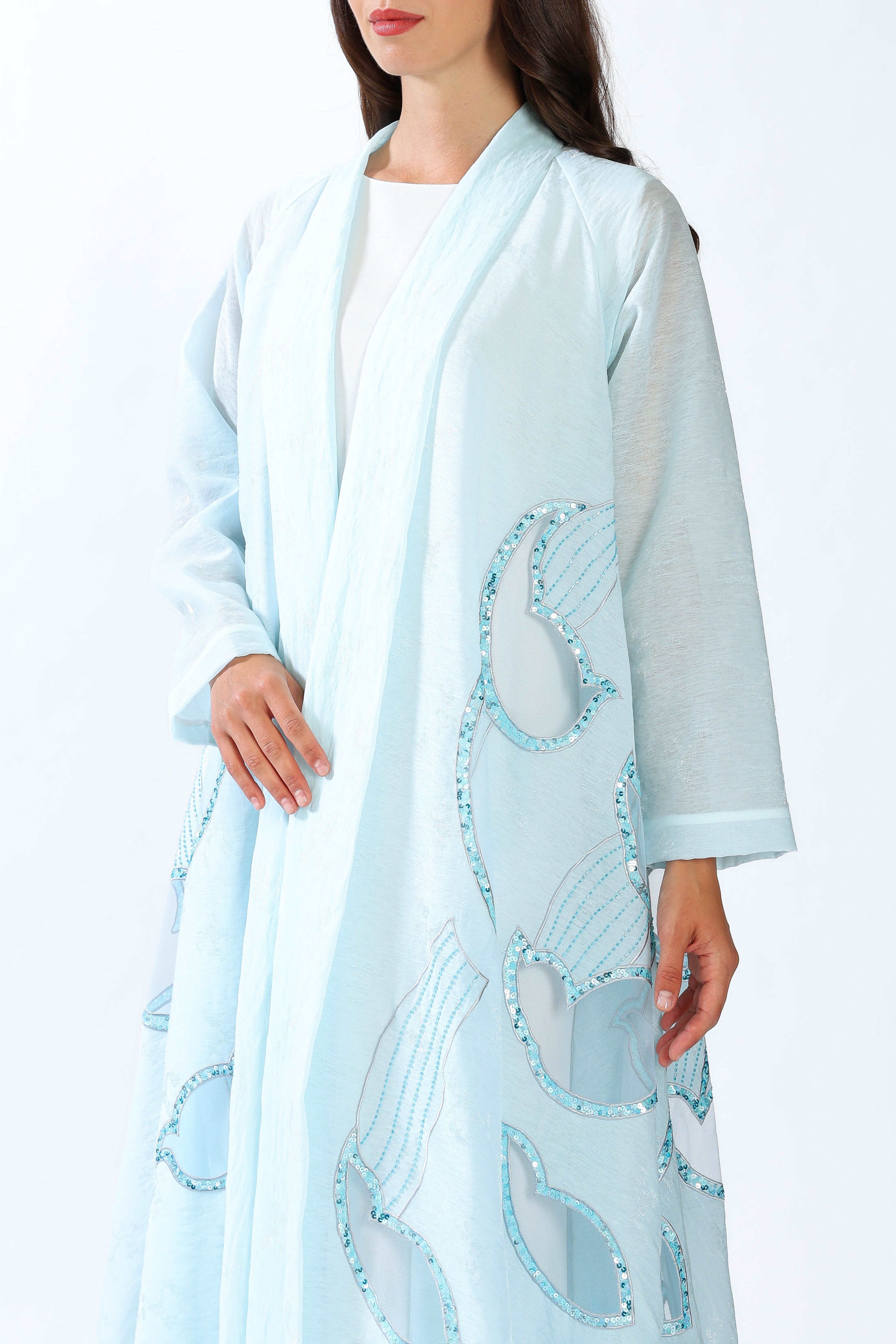 Hand embroidered Blooming Petals design on Baby Blue Jacquard Organza material.