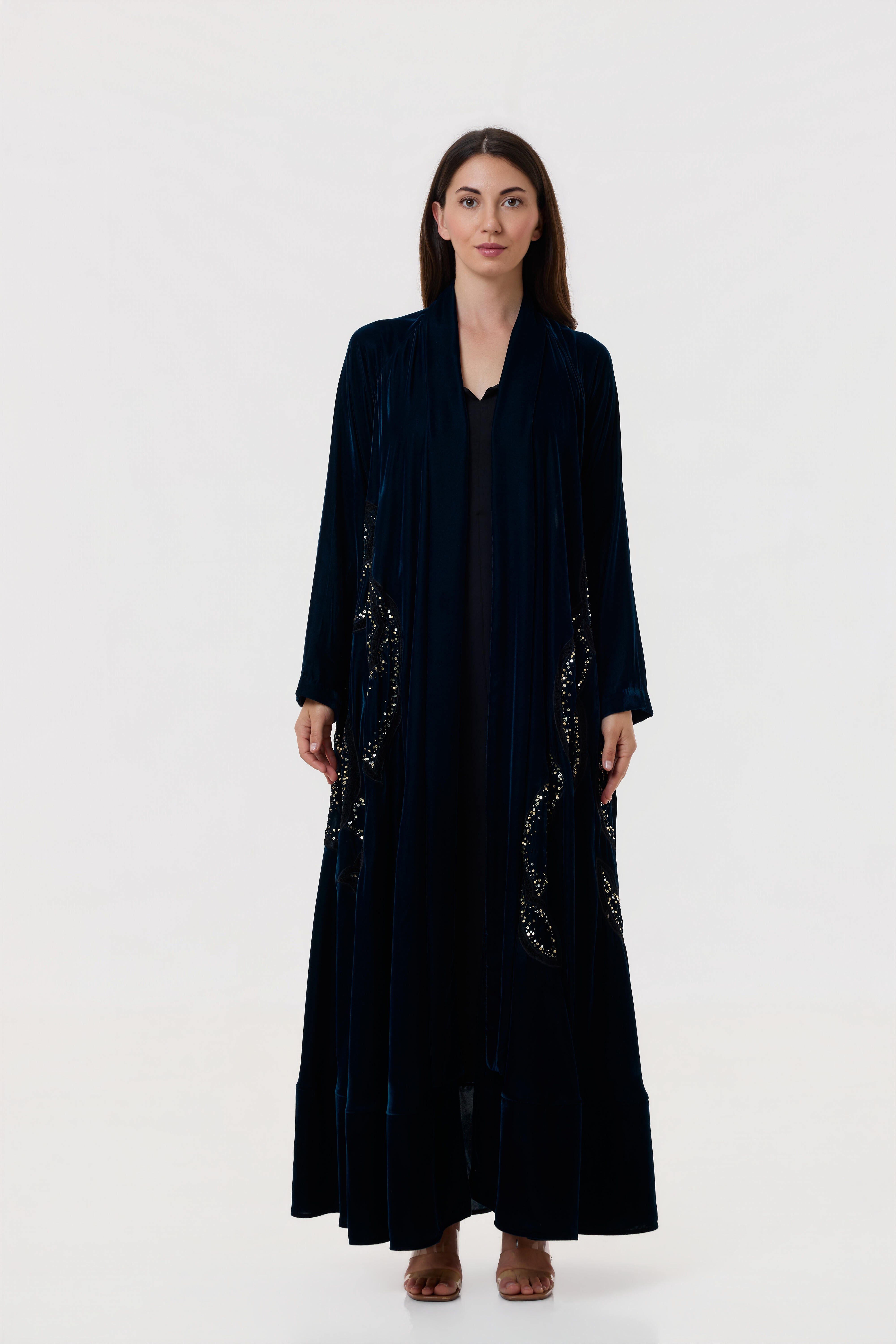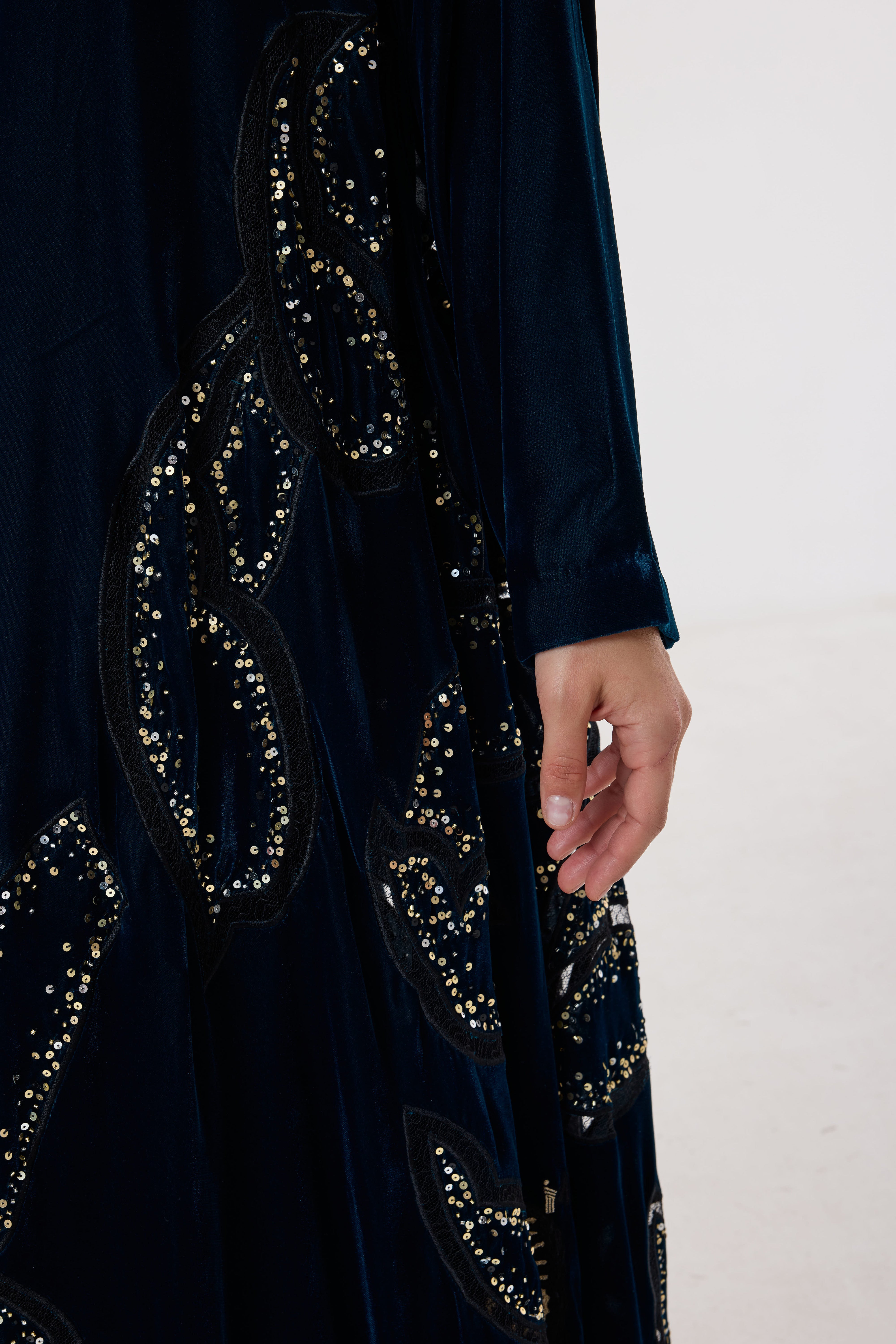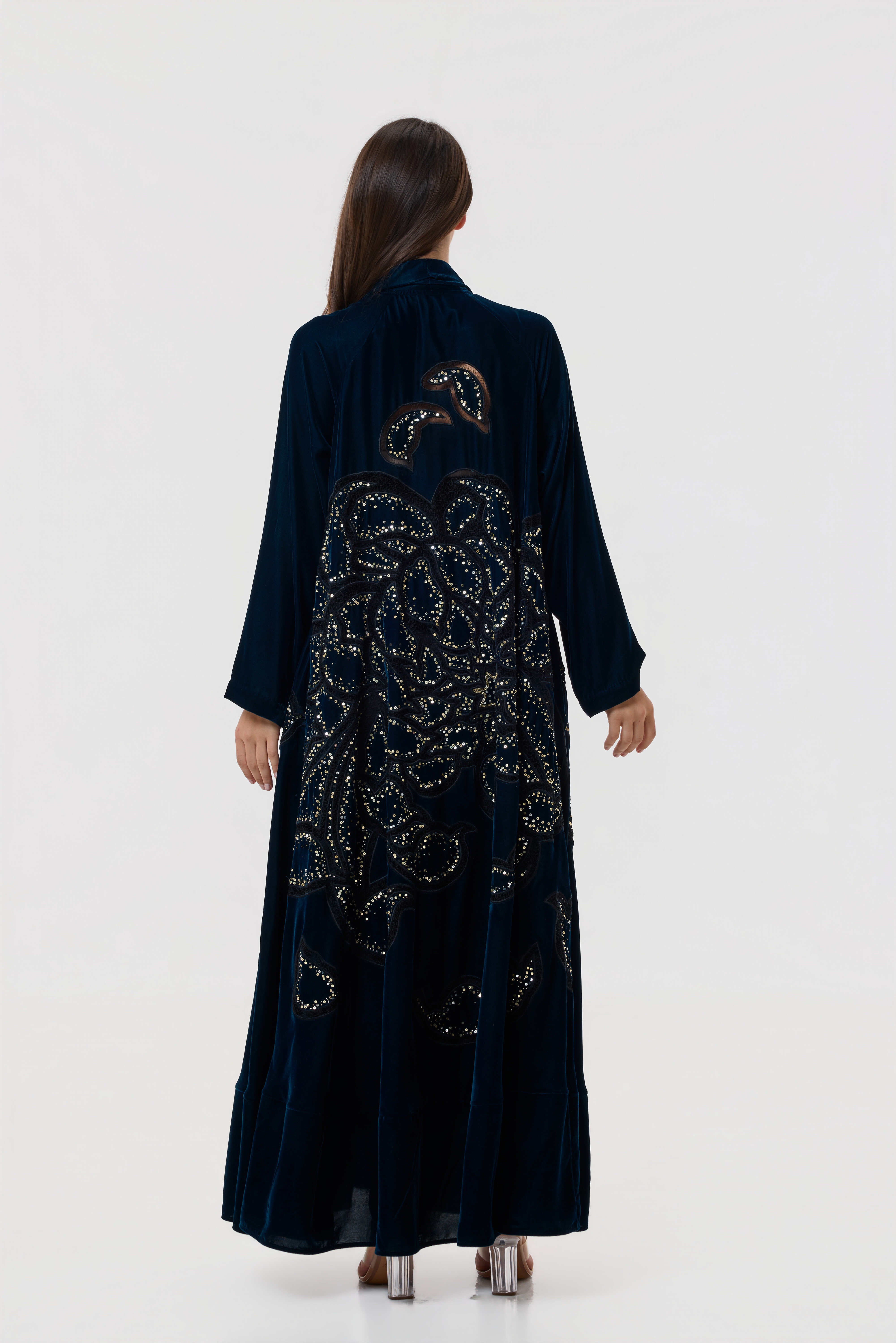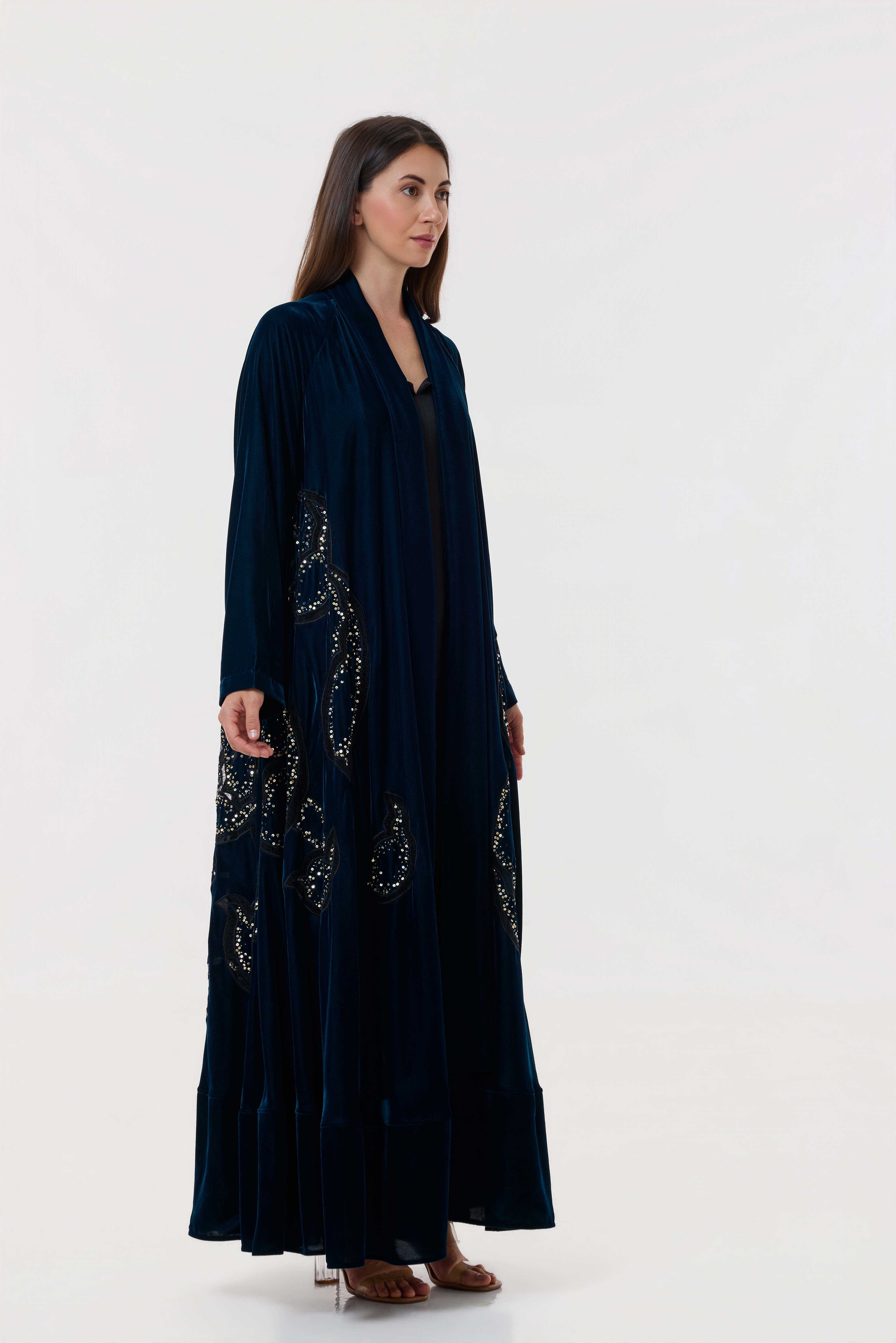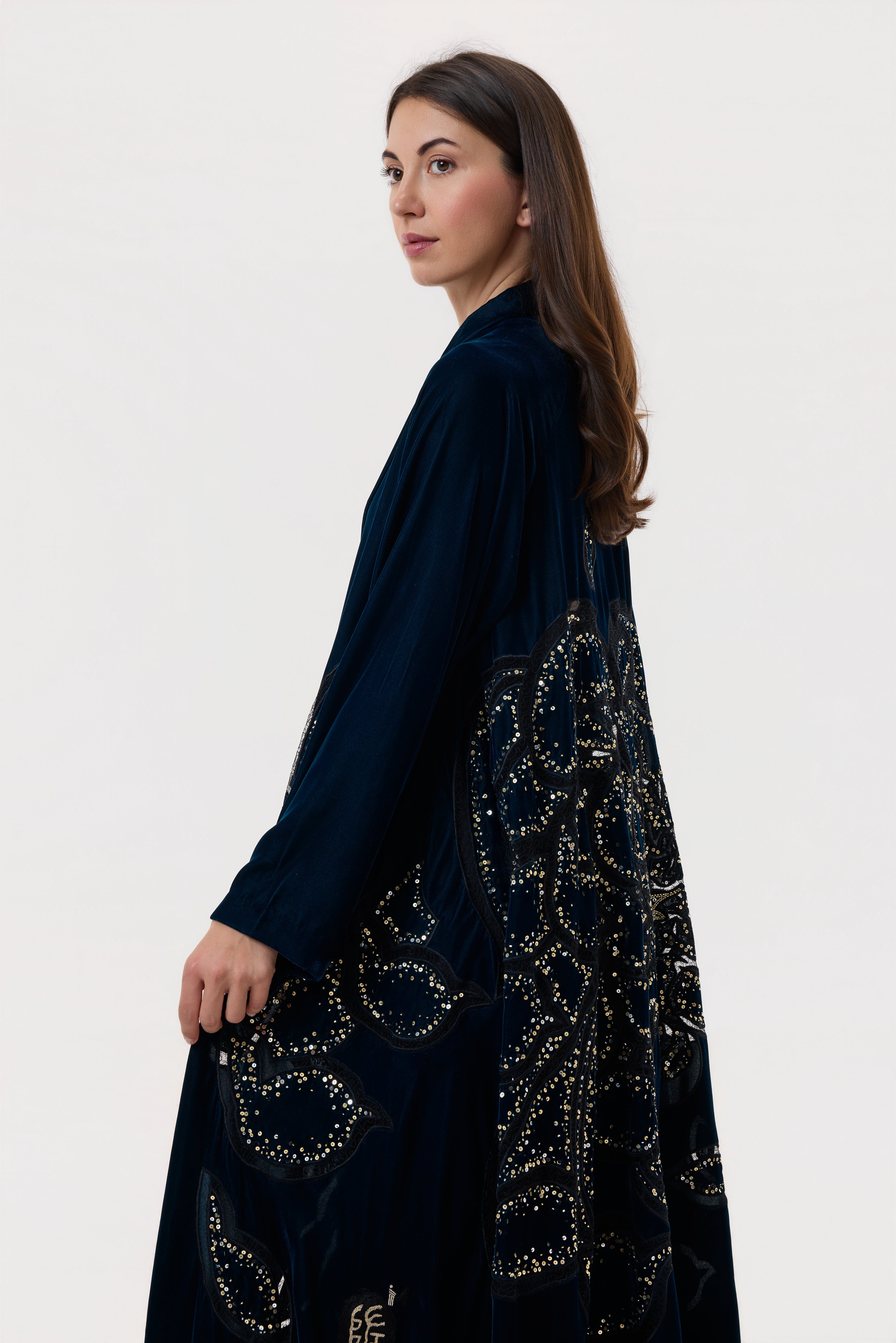 Hand embroidered Blooming Petals design on Blue Velvet Material