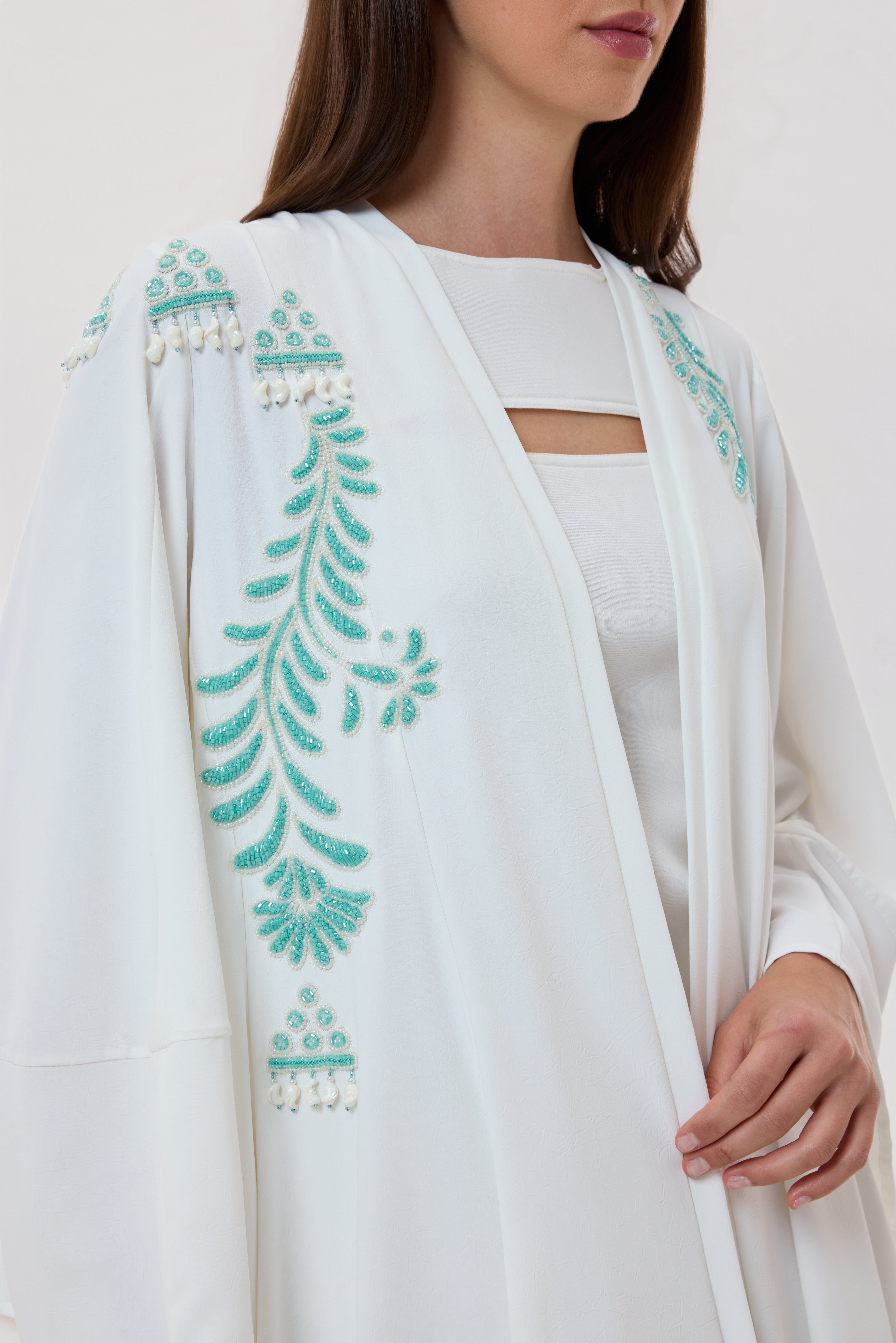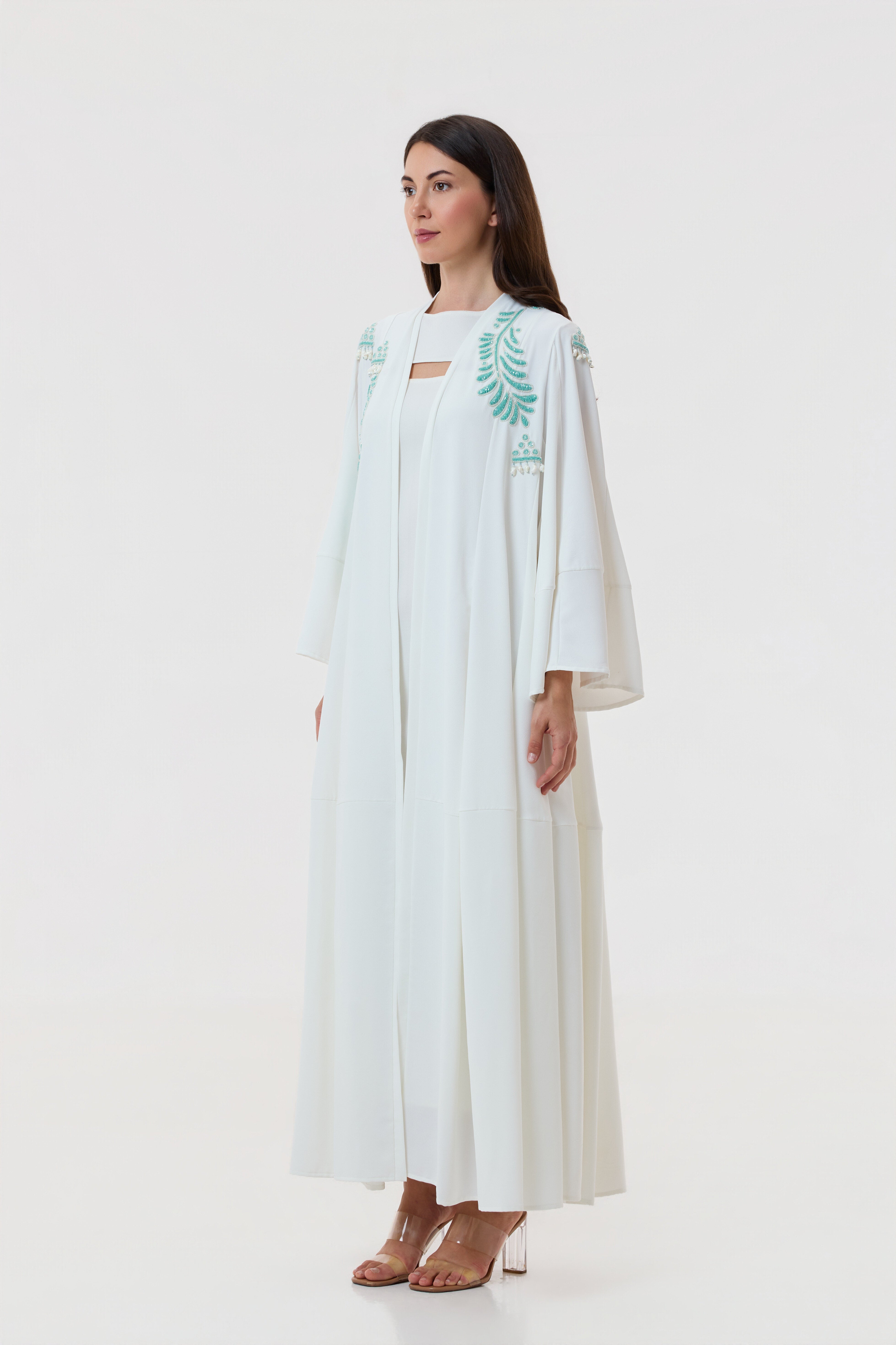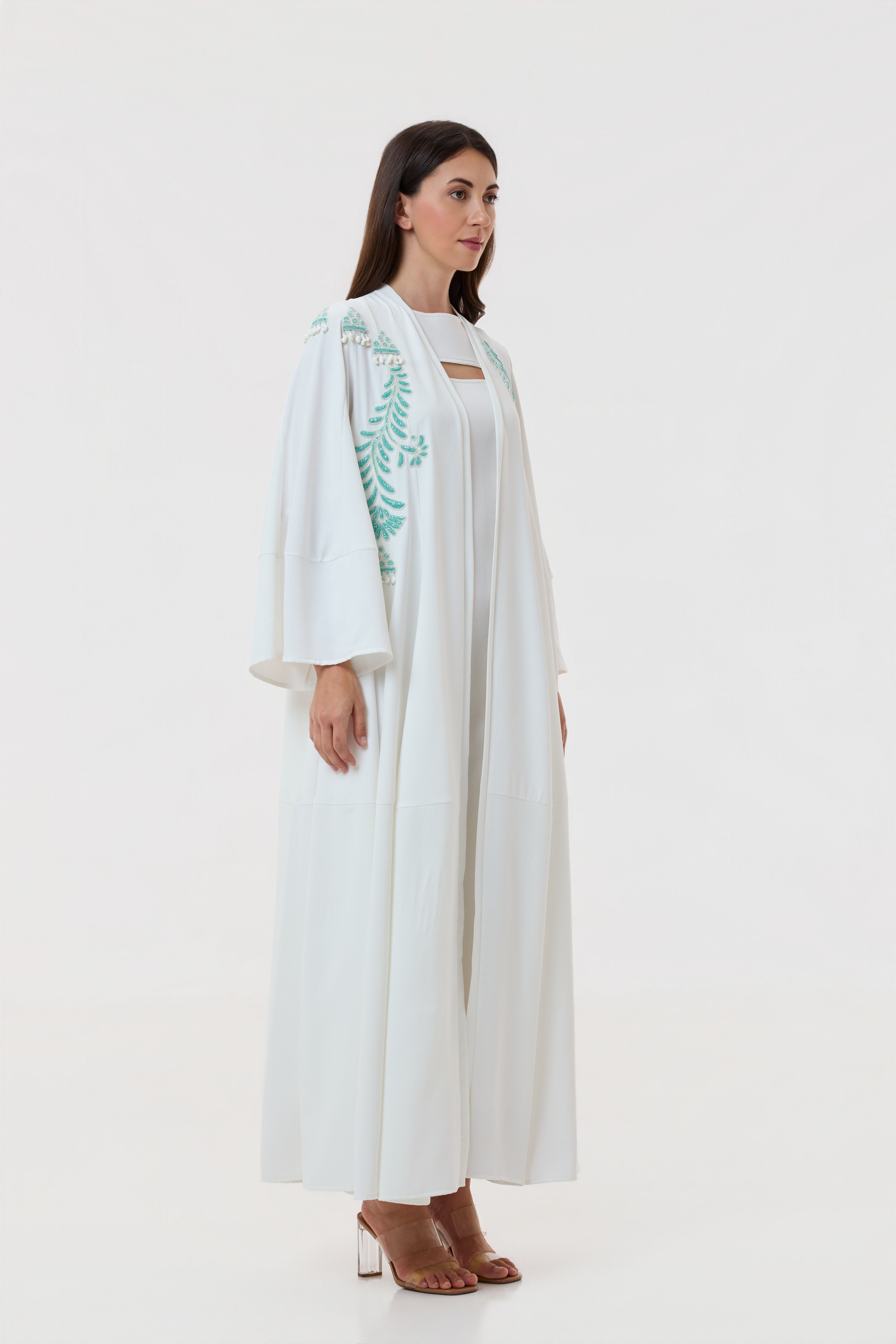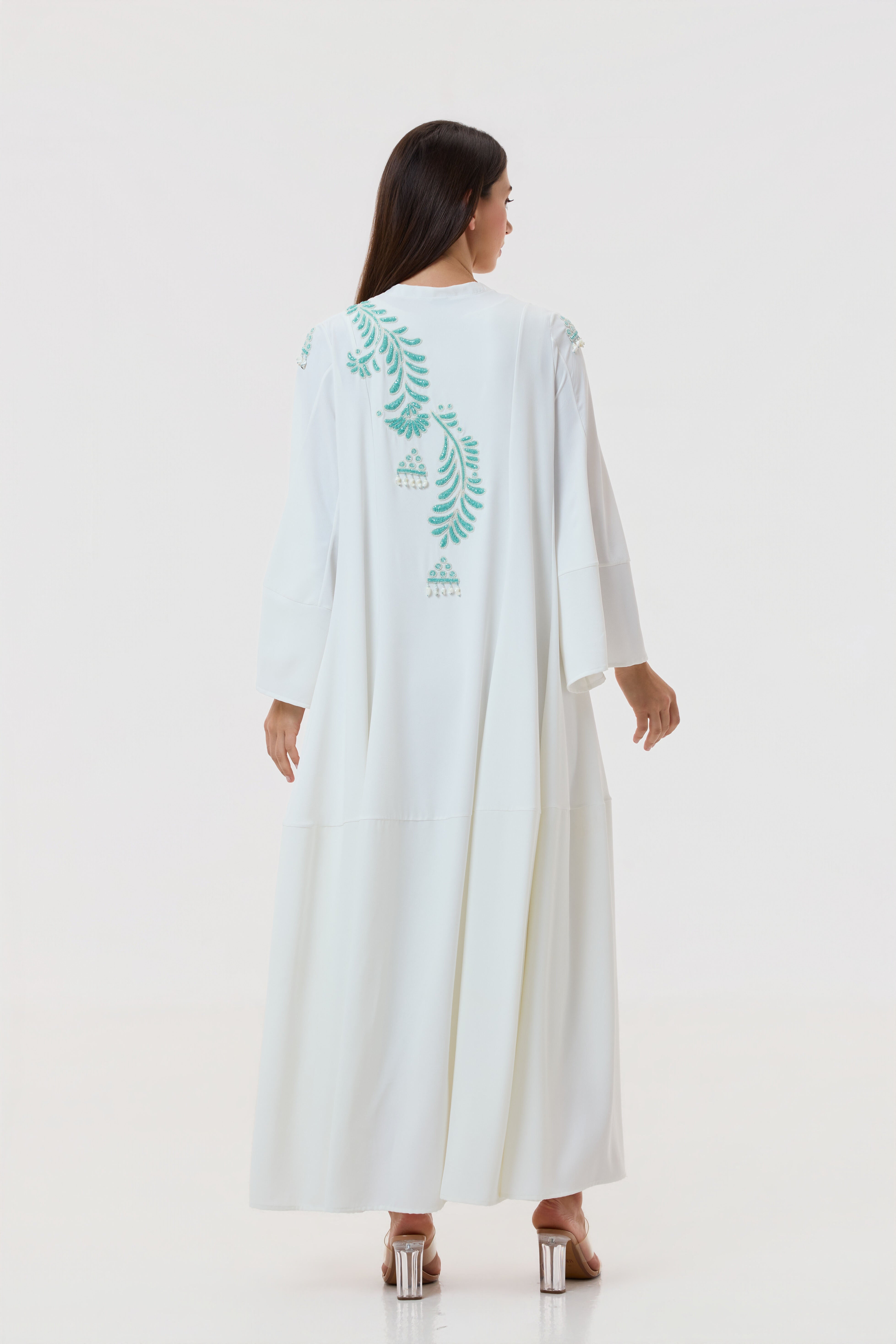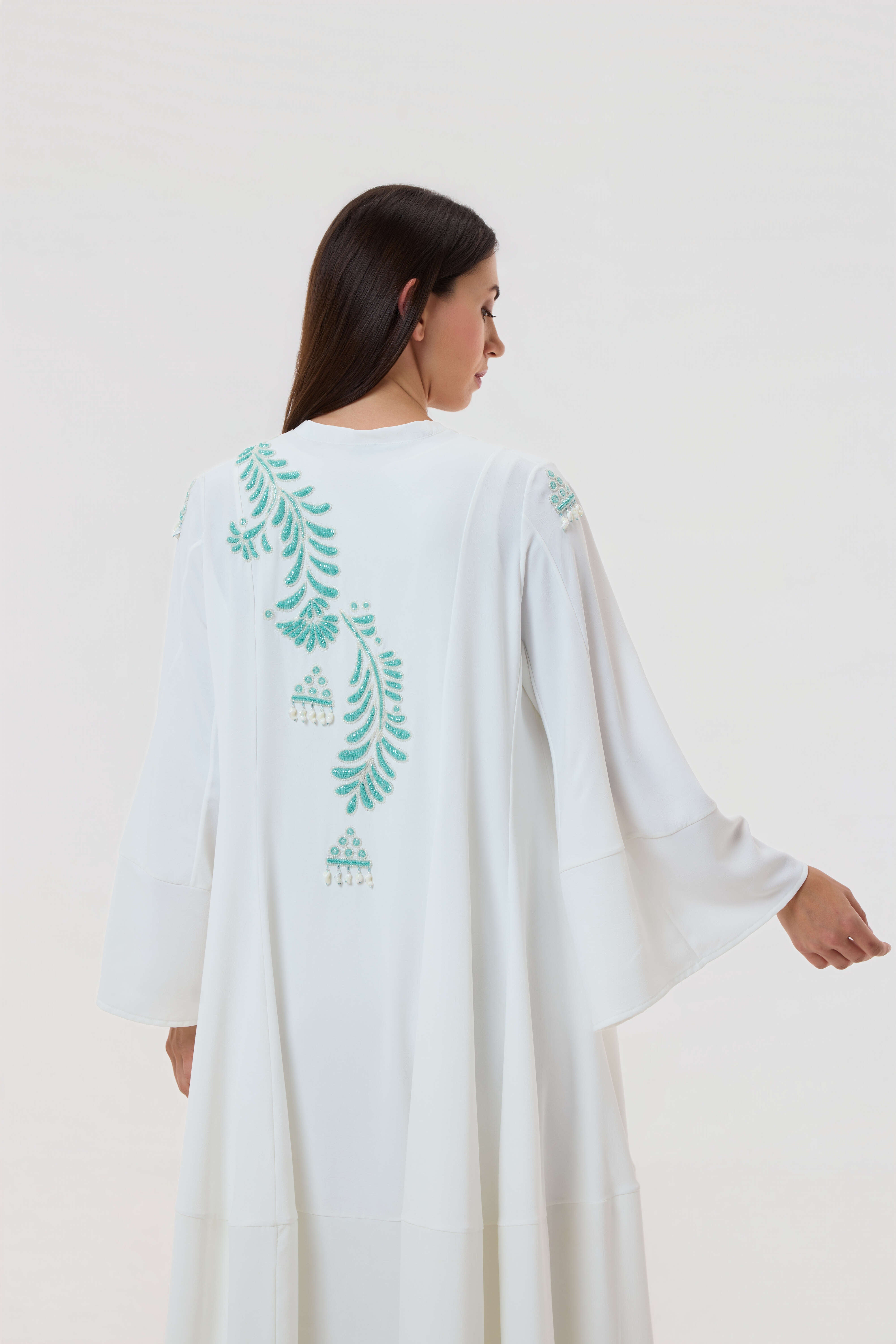 Crafted from flowing white crepe, this occasion abaya features intricate greenery embroidery and gentle shell accents for natural, understated elegance