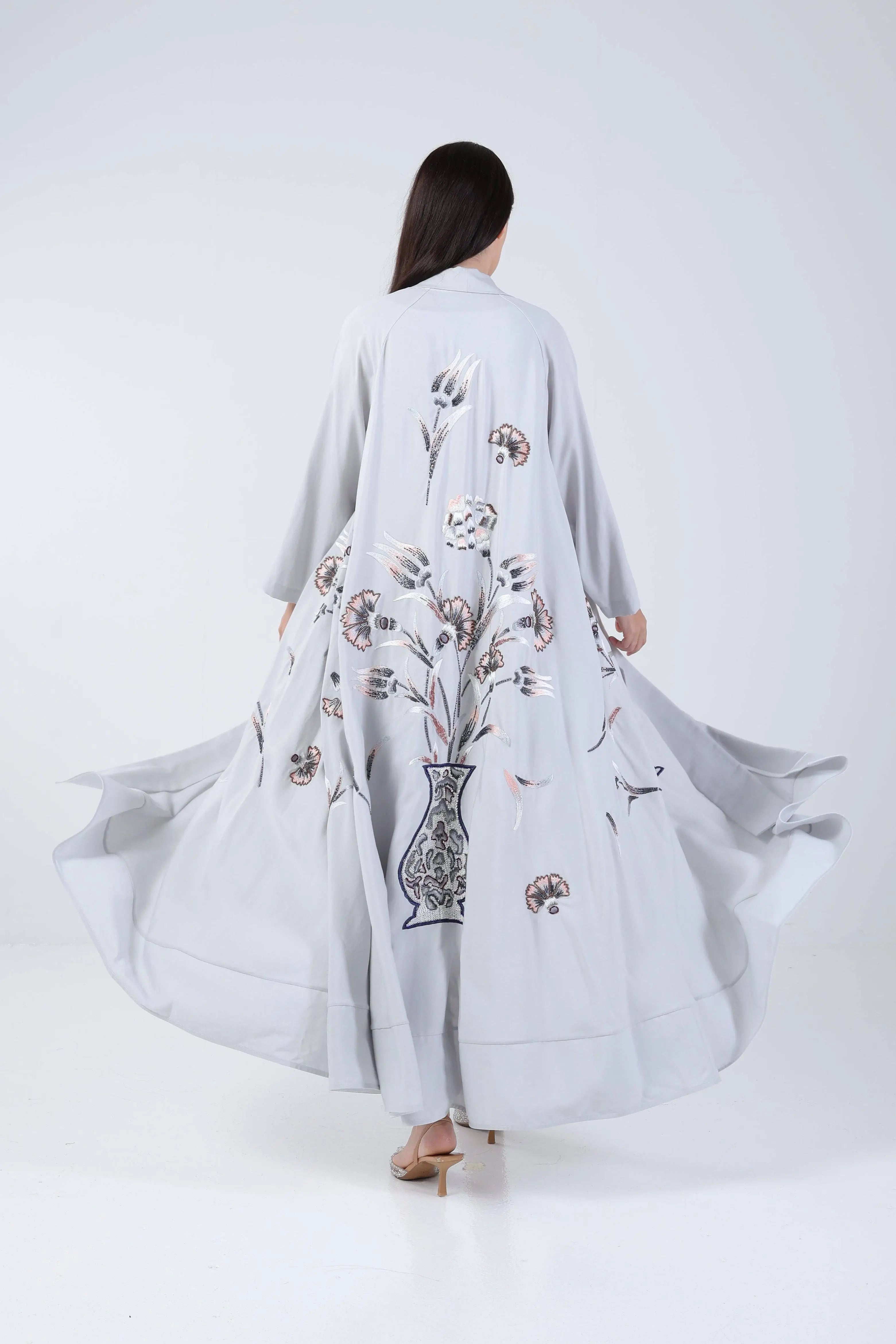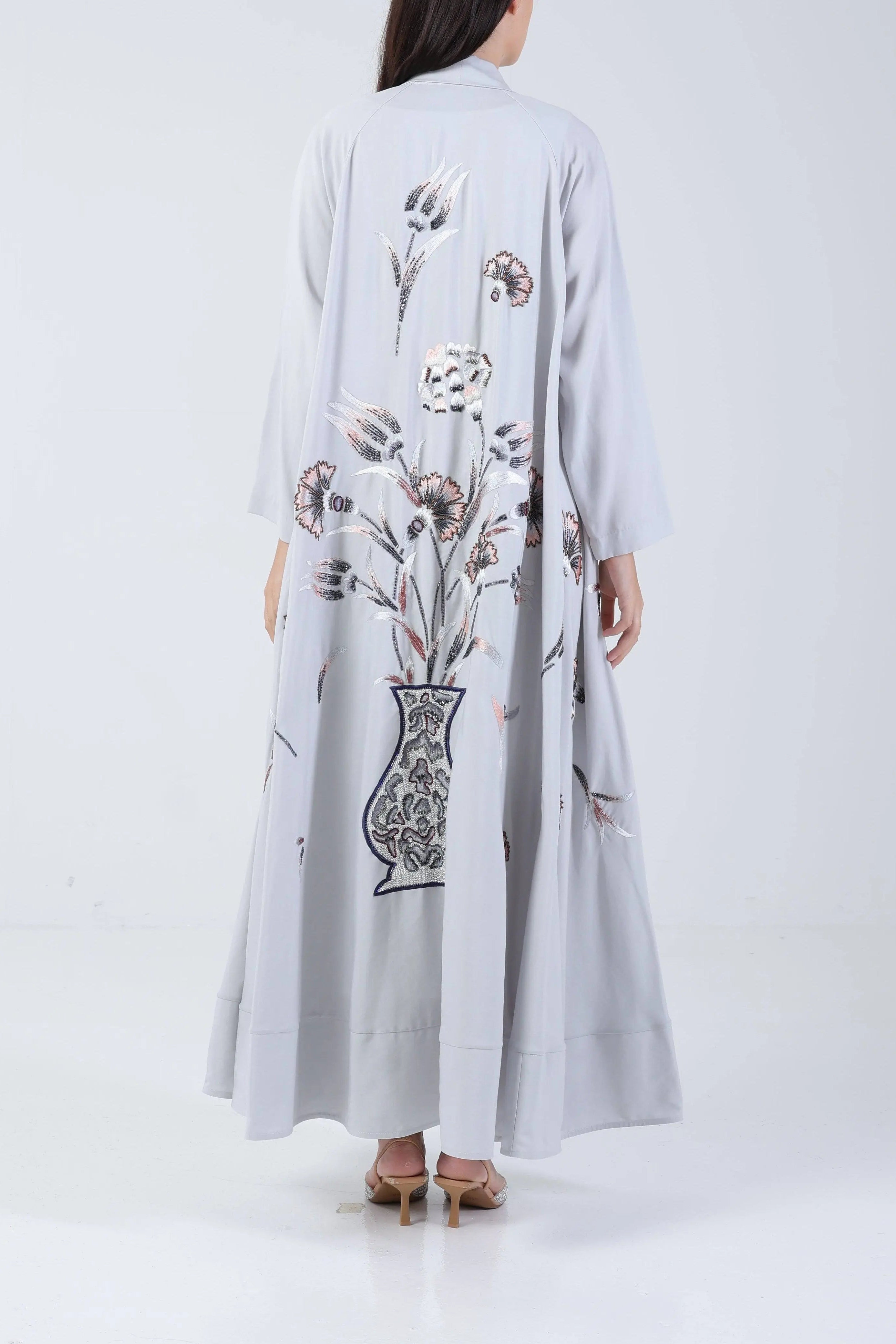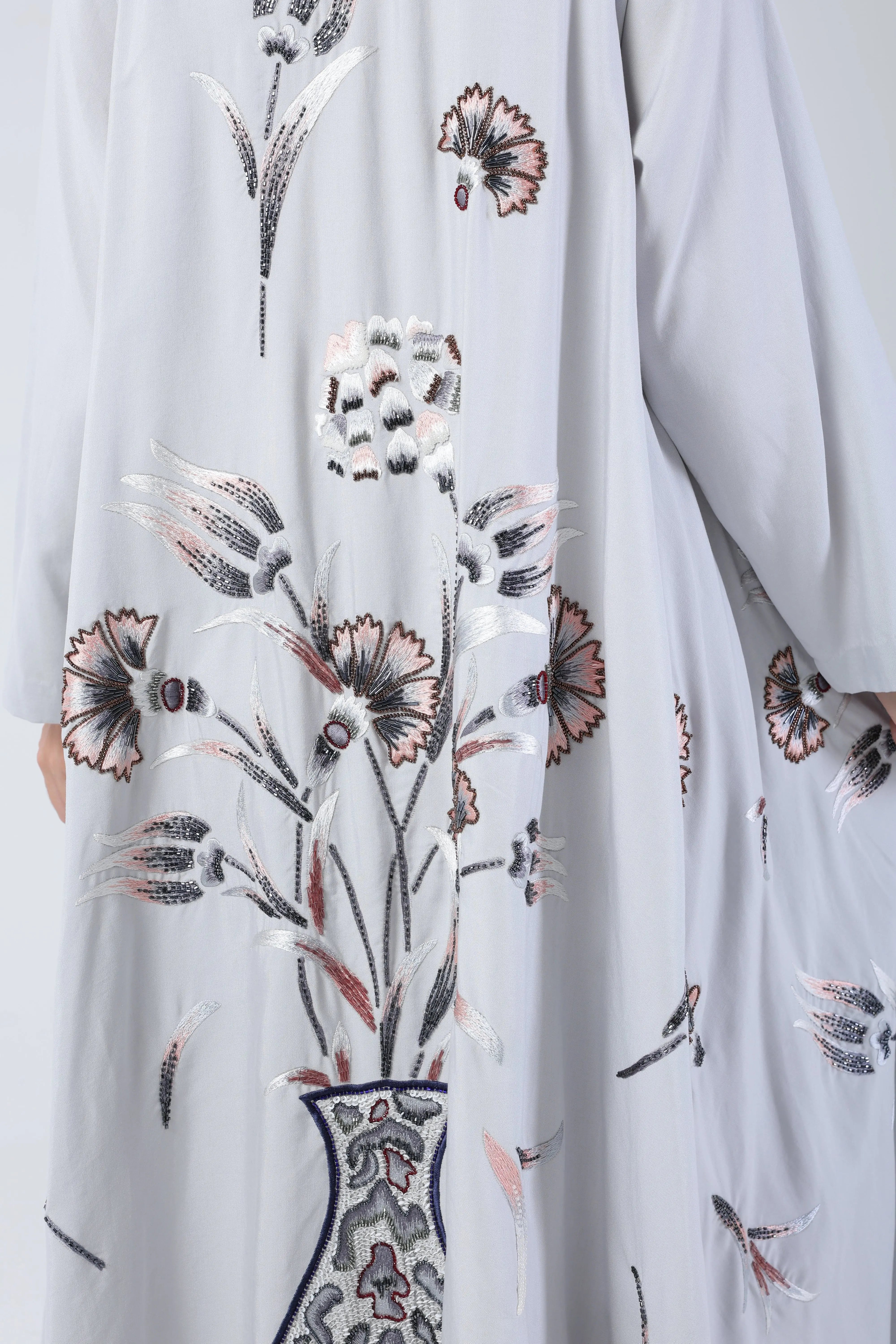 Hand embroidered Antique Chinese Vessel design on Grey Cotton fabric