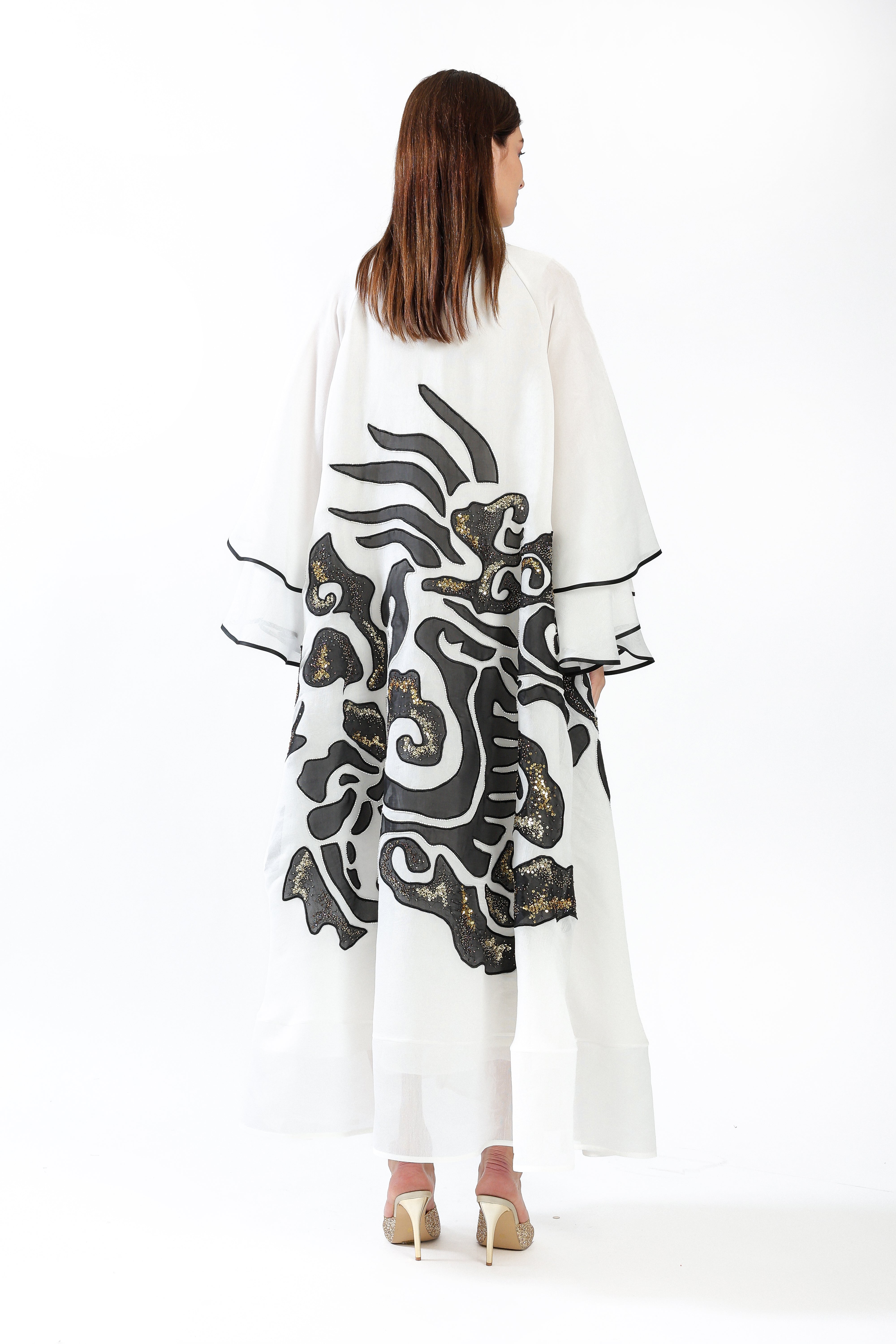 An evening piece crafted from white jacquard organza, featuring a luminous Ember design brought to life through intricate bead and sequin embroidery