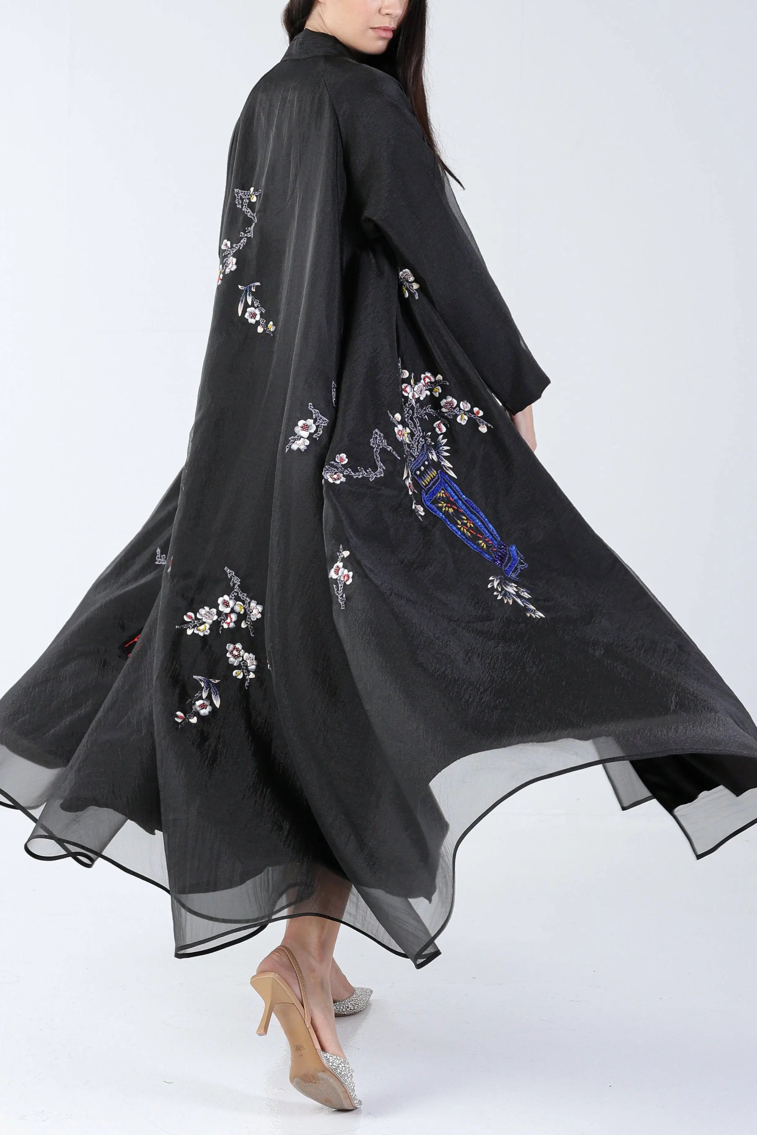 Hand embroidered Floral Vase design in Black Organza material