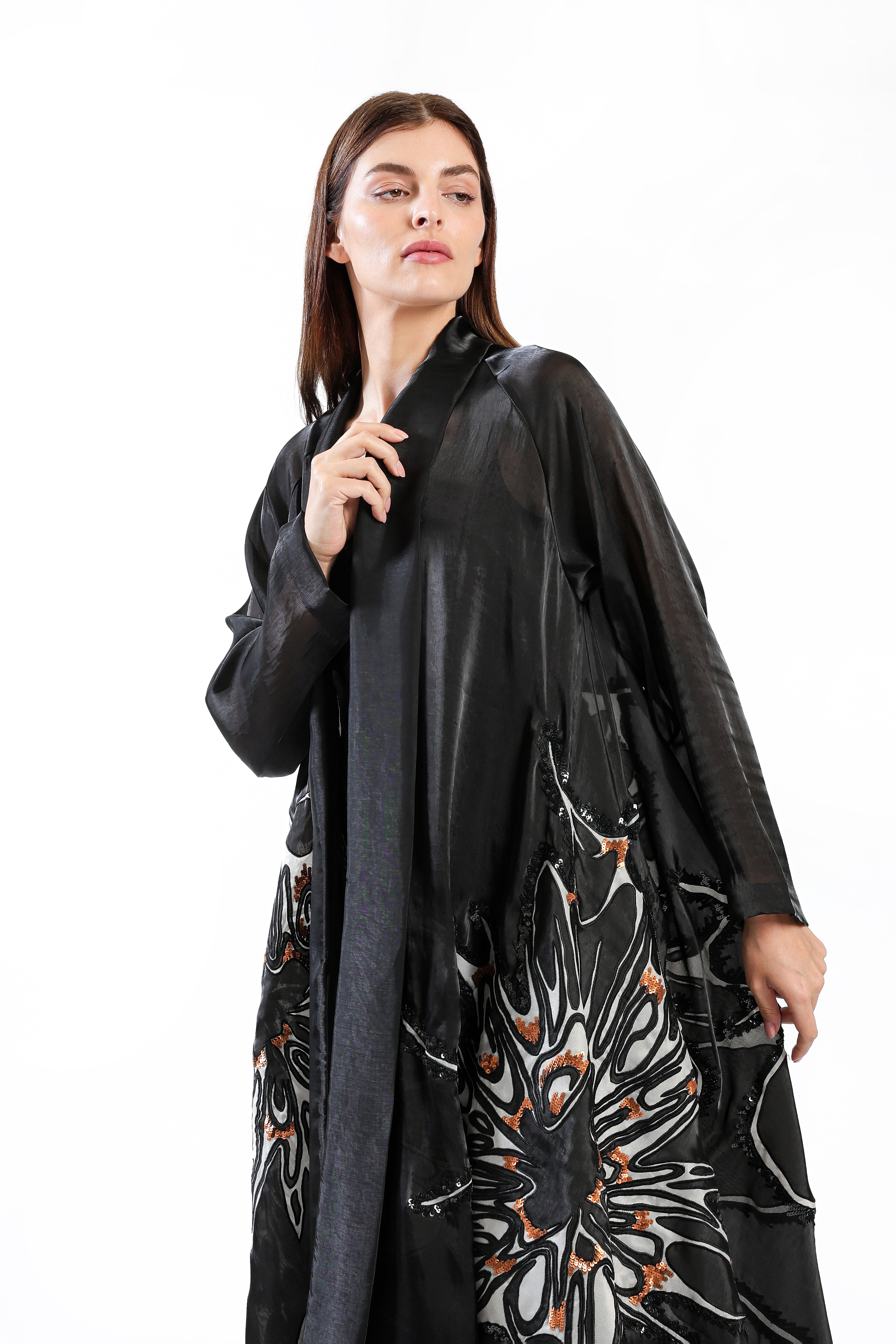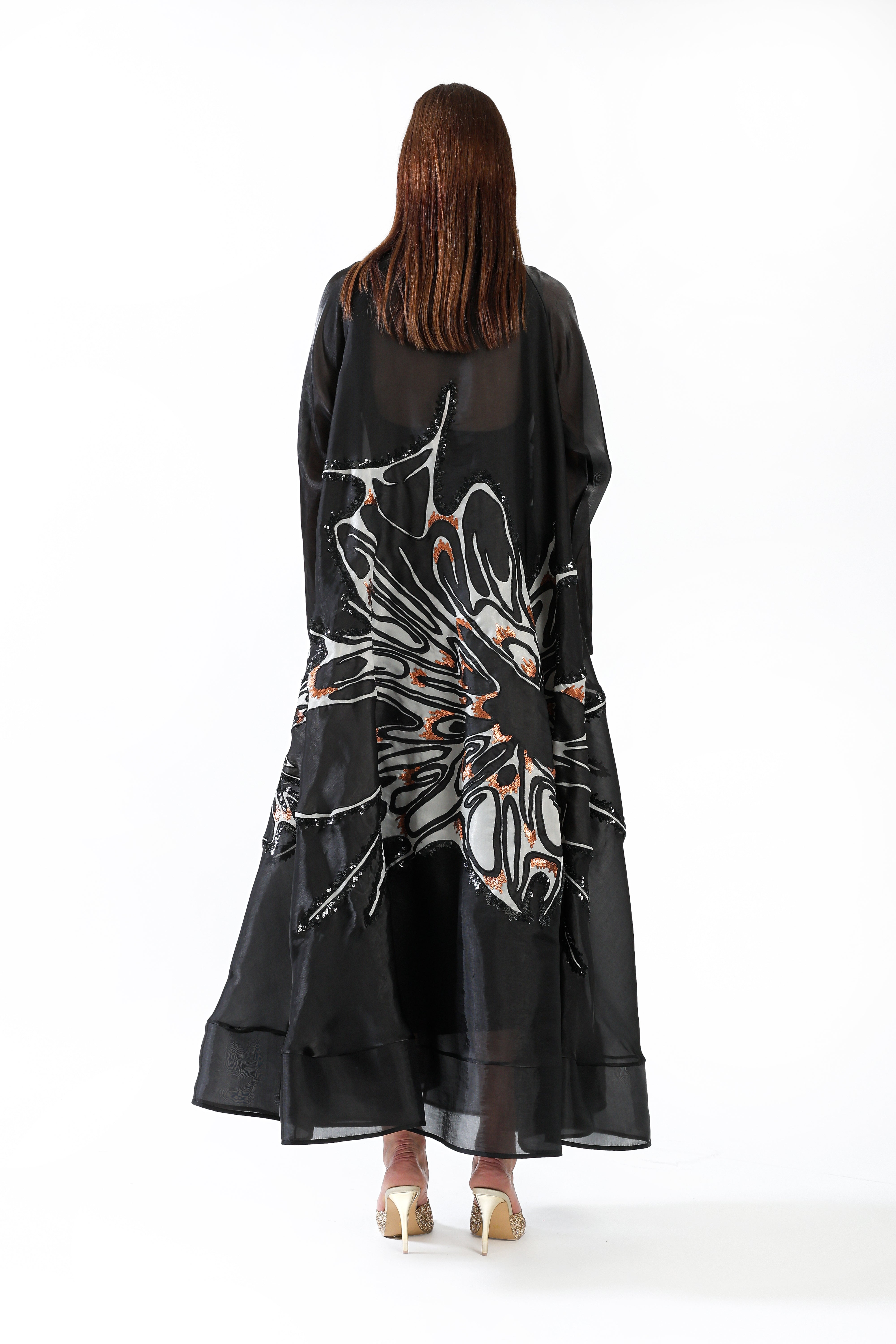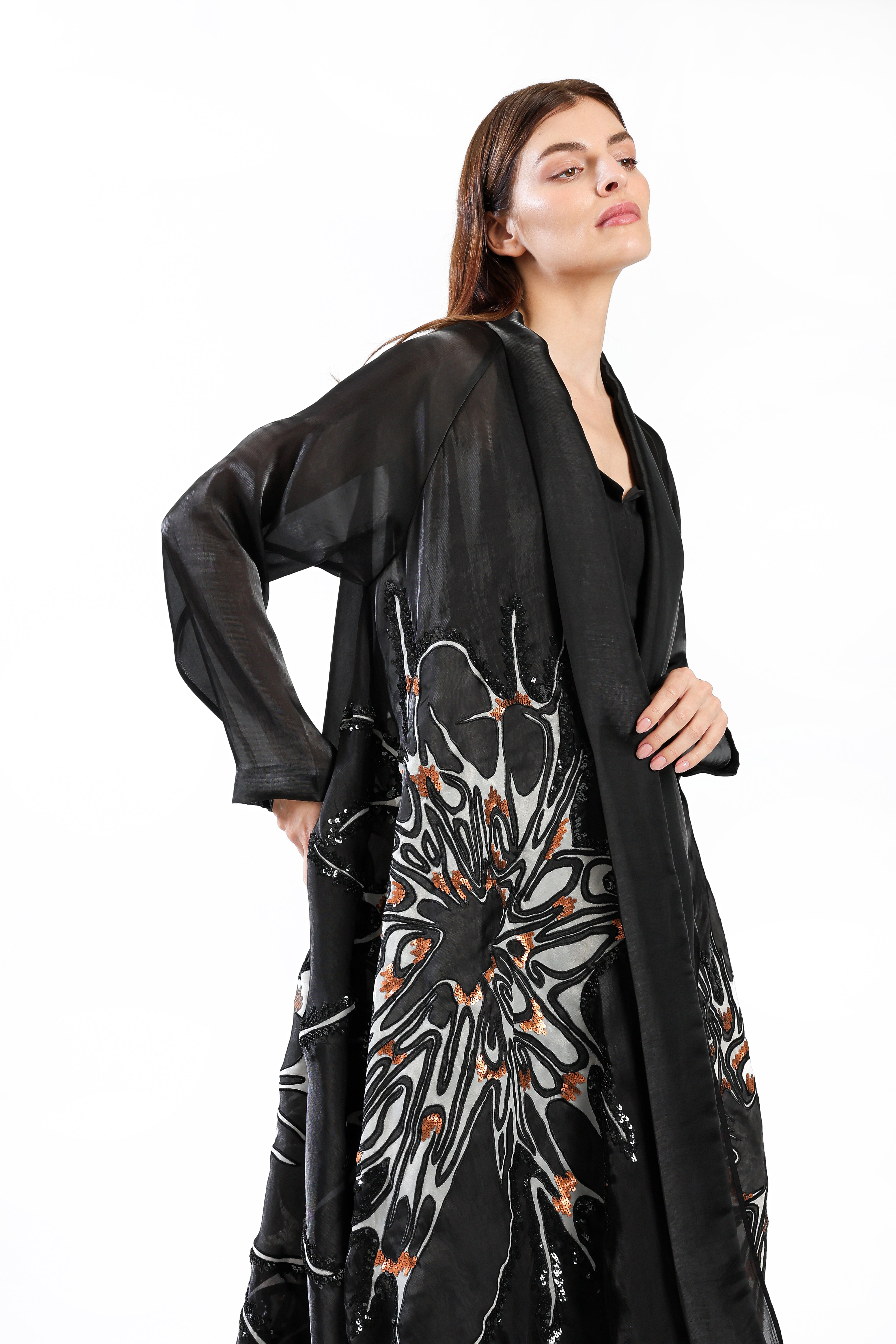 A refined evening abaya crafted from black Fendi organza, featuring striking oversized floral embroidery brought to life with shimmering sequins and delicate beadwork.
