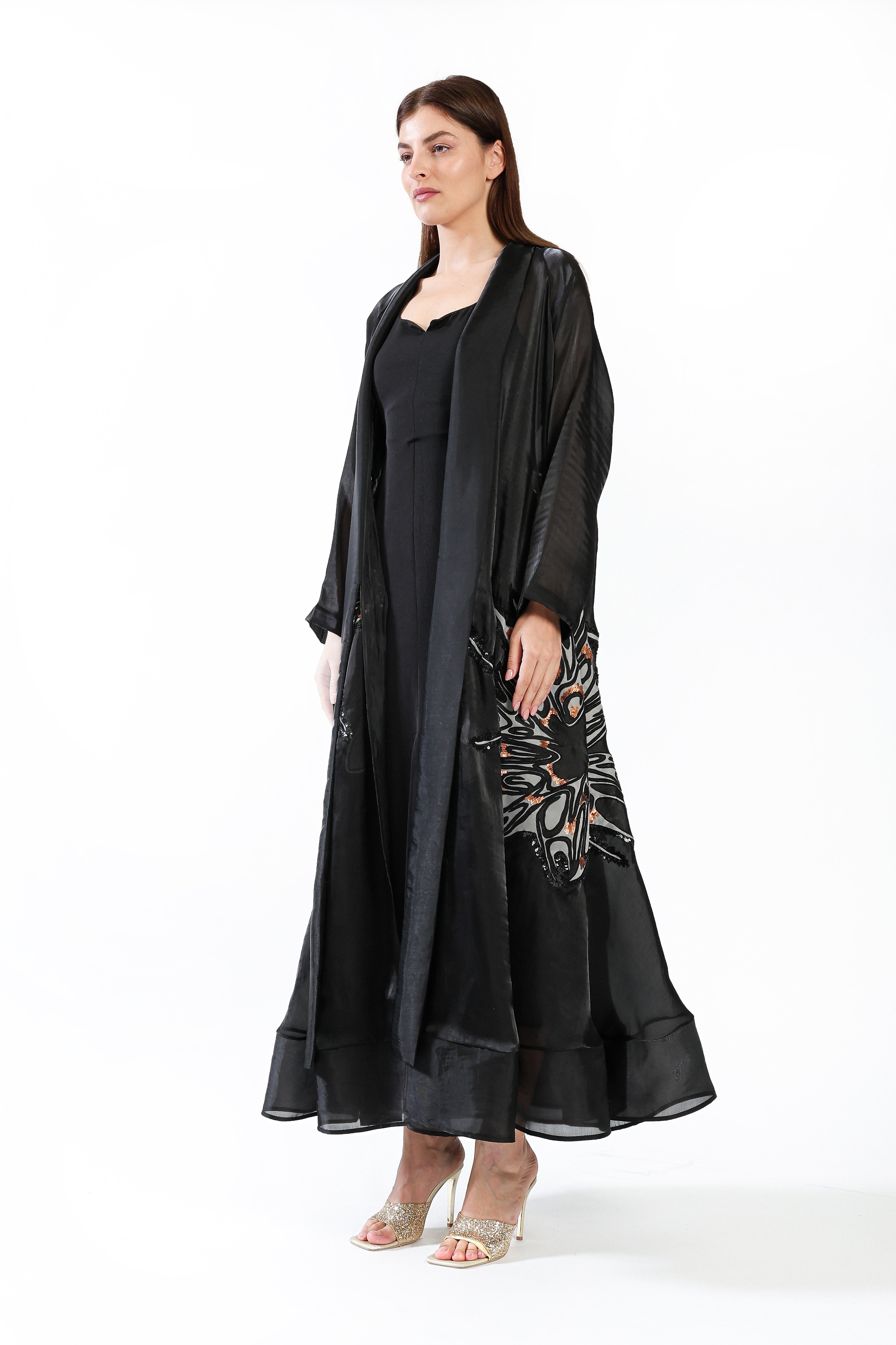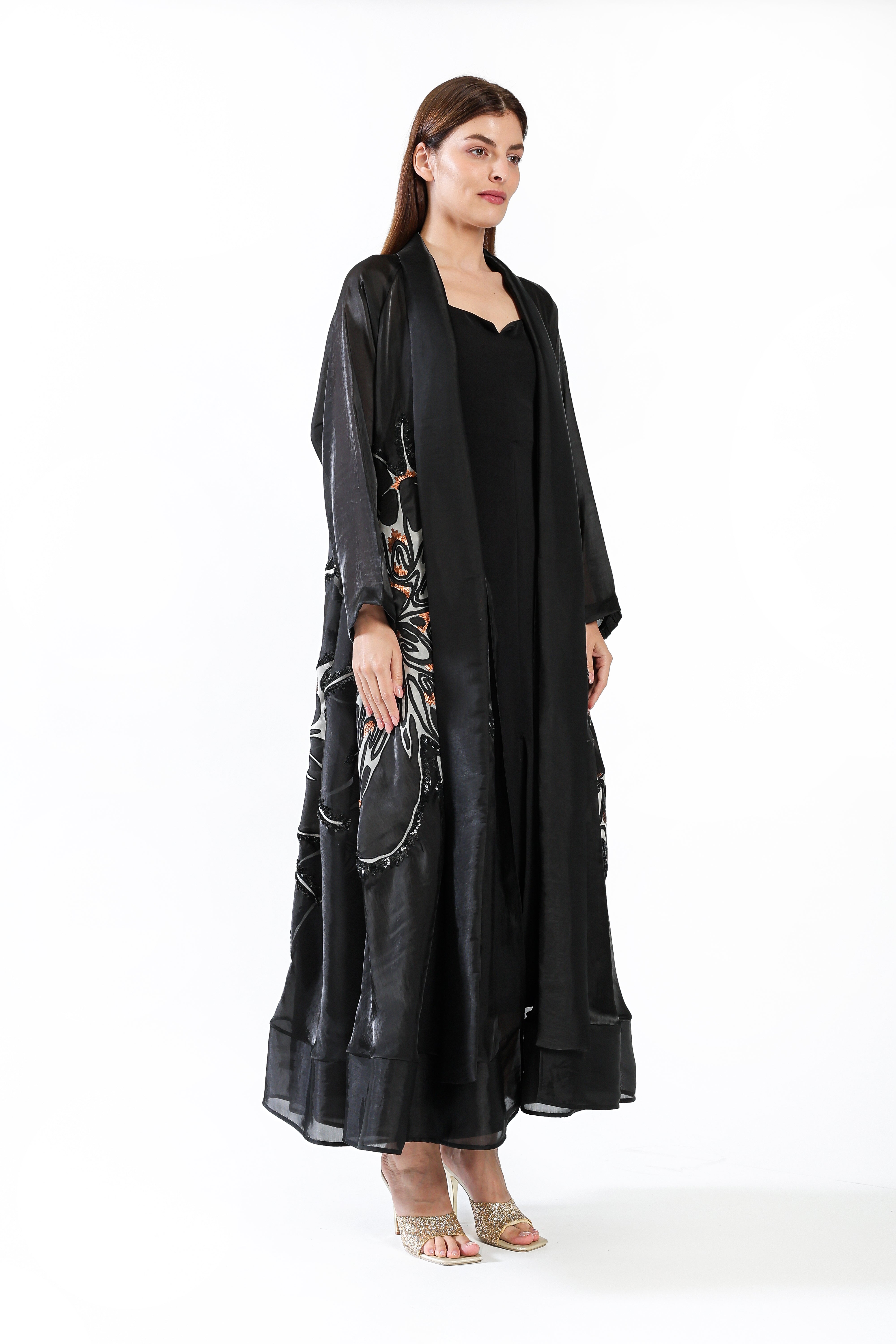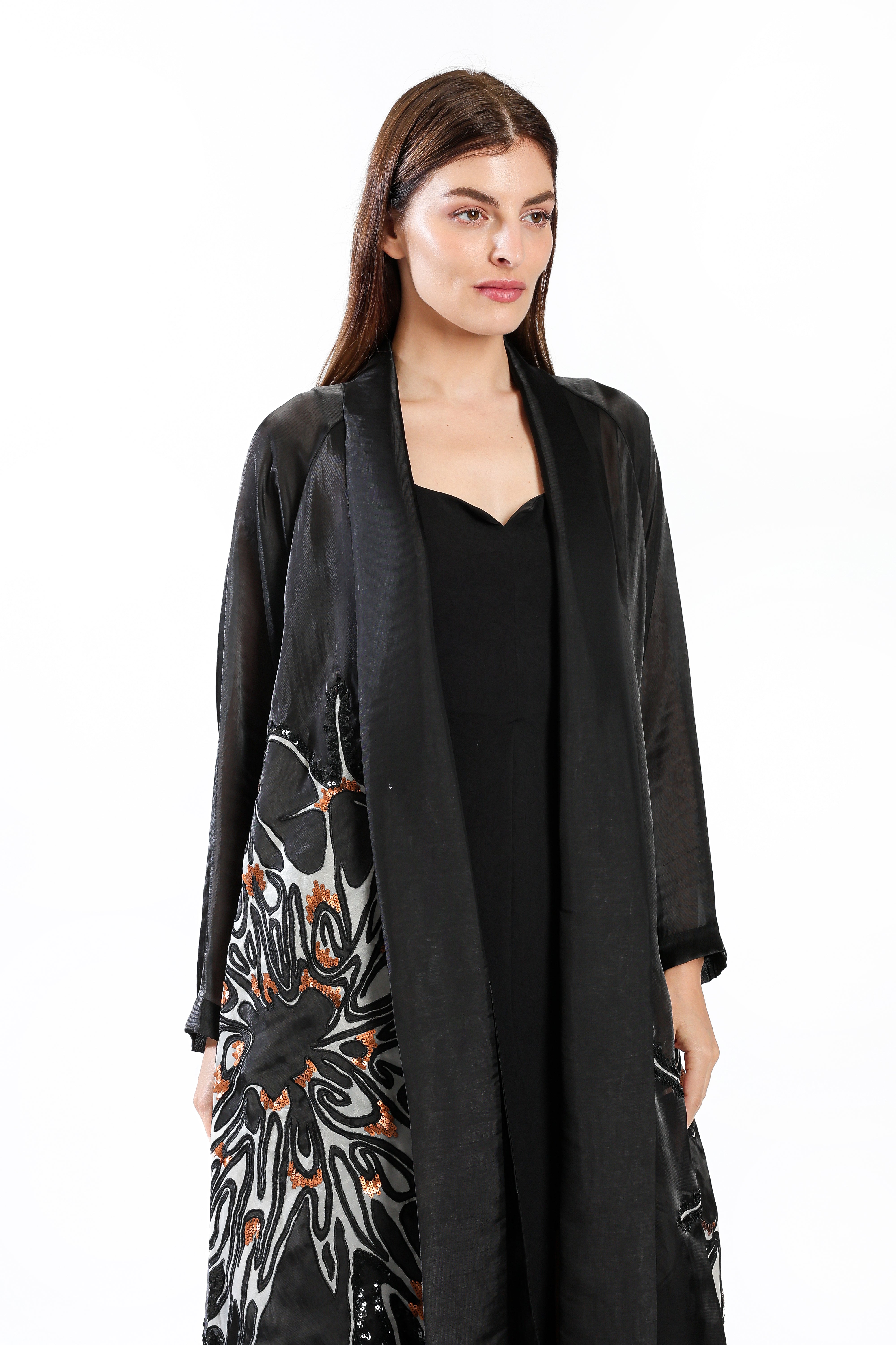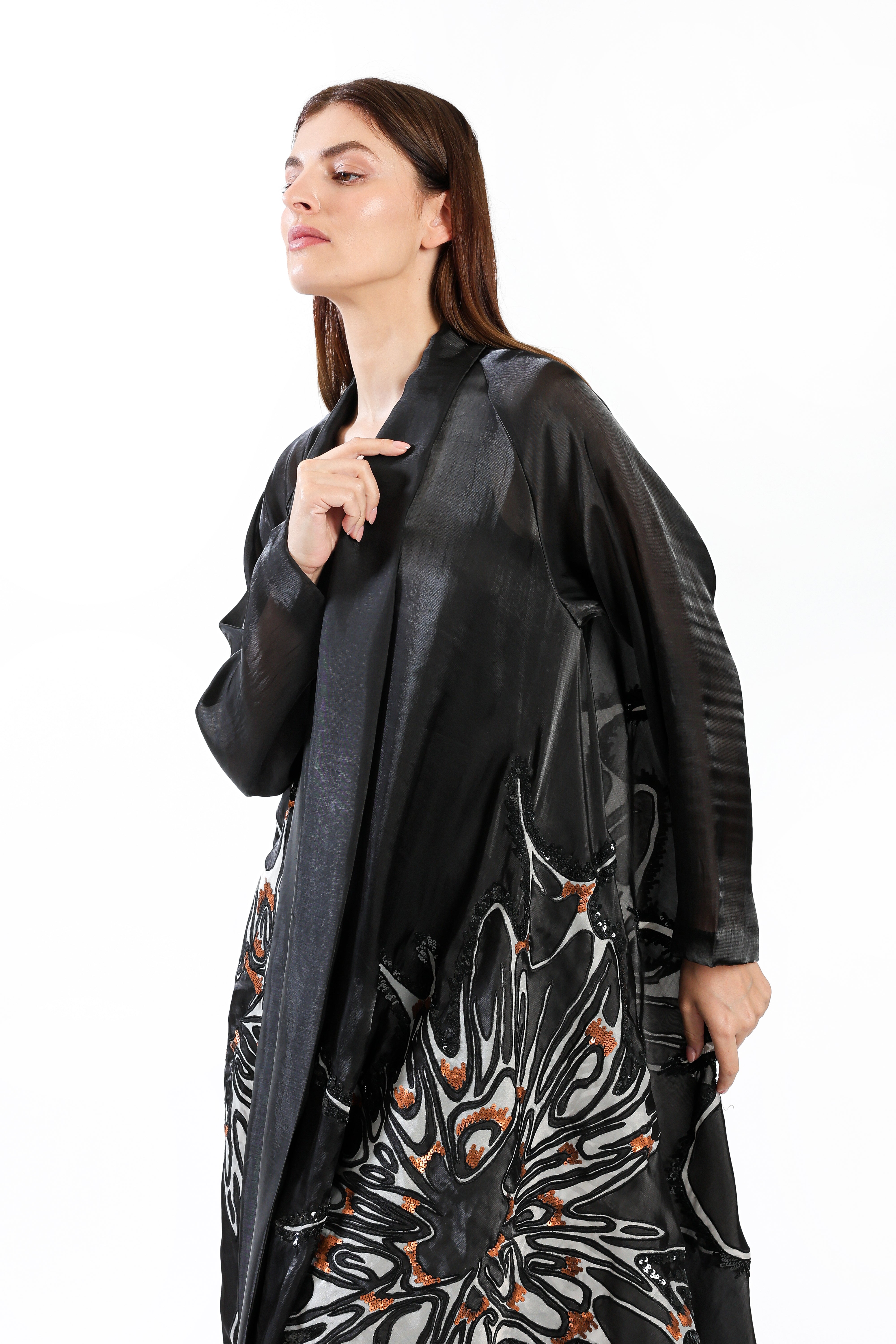 A refined evening abaya crafted from black Fendi organza, featuring striking oversized floral embroidery brought to life with shimmering sequins and delicate beadwork.