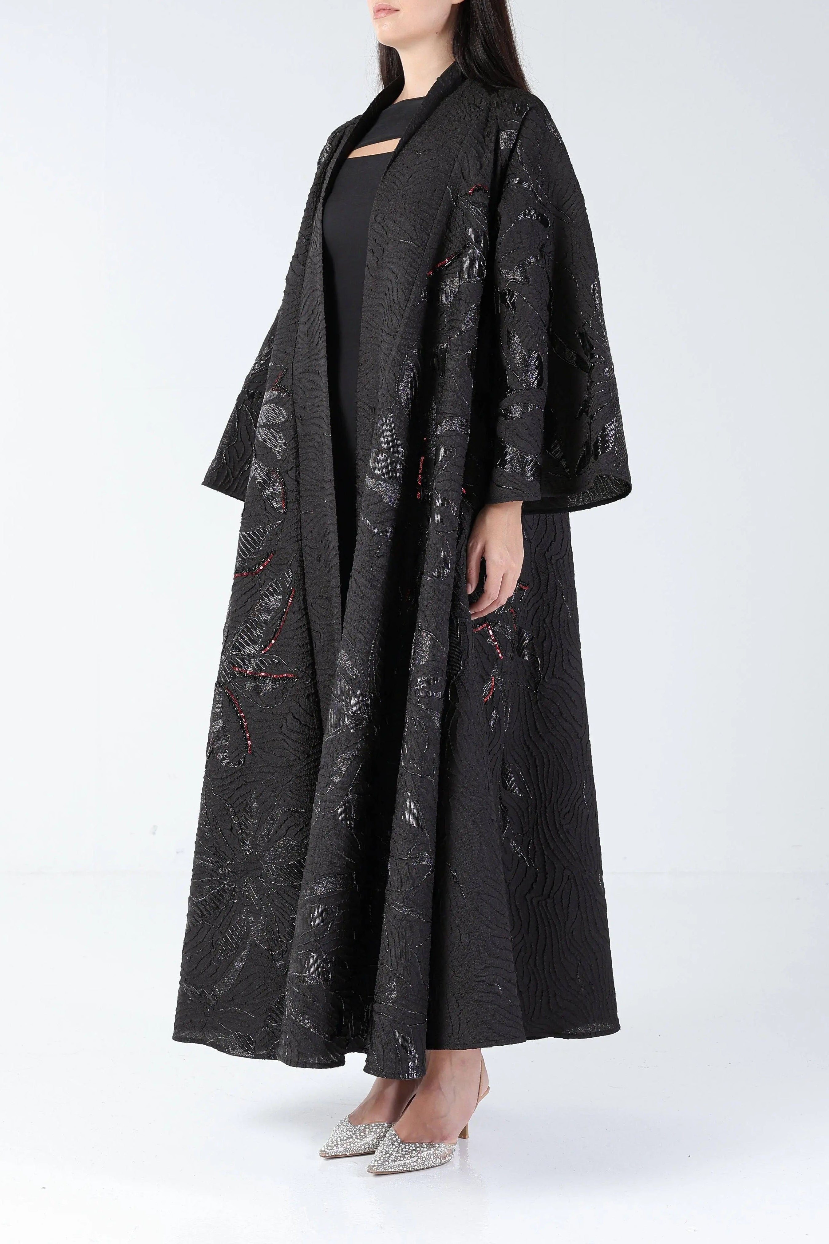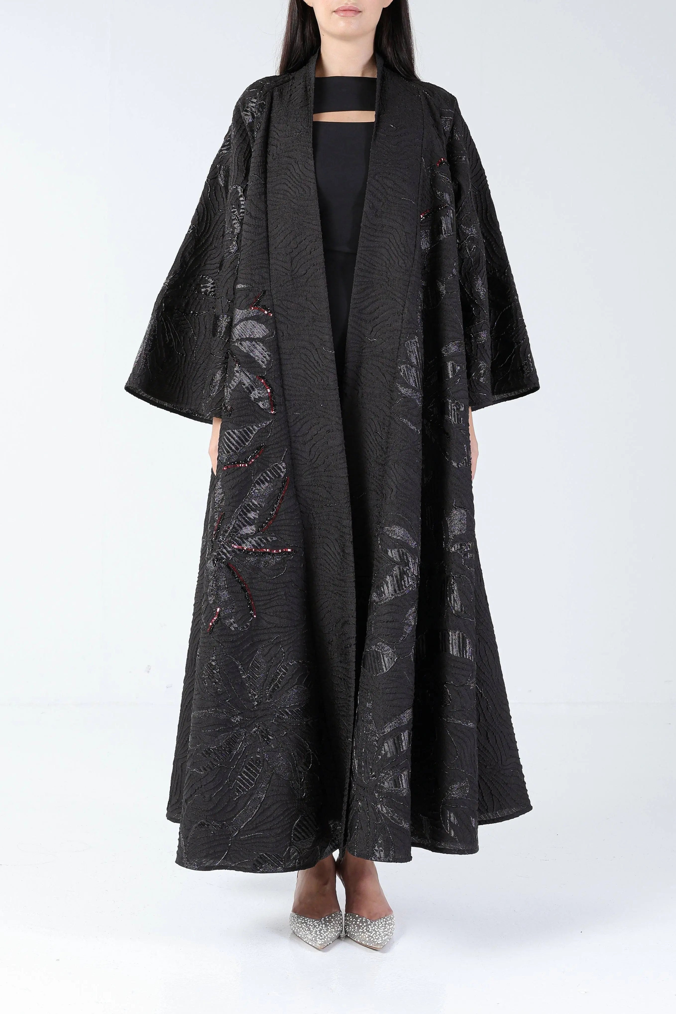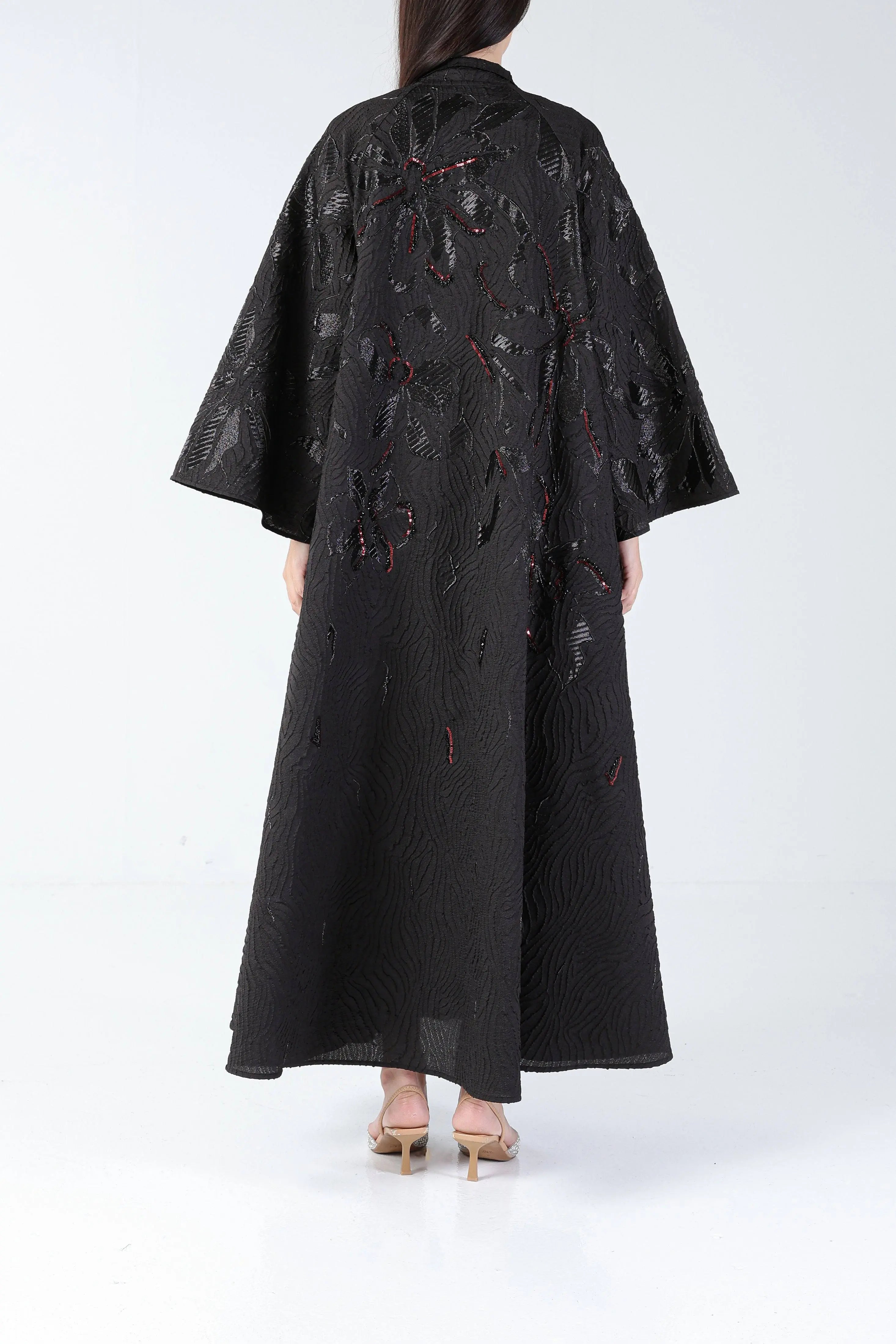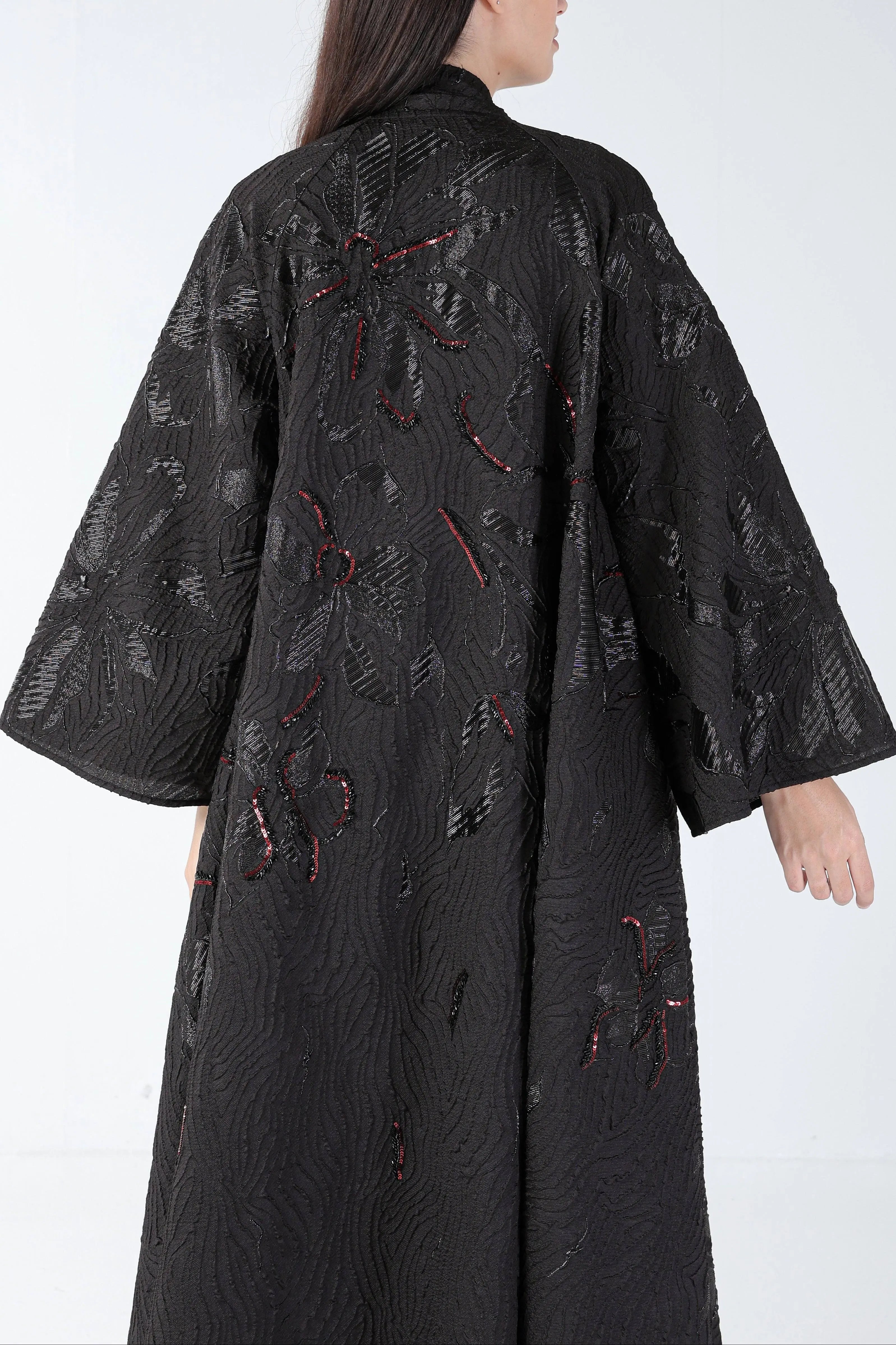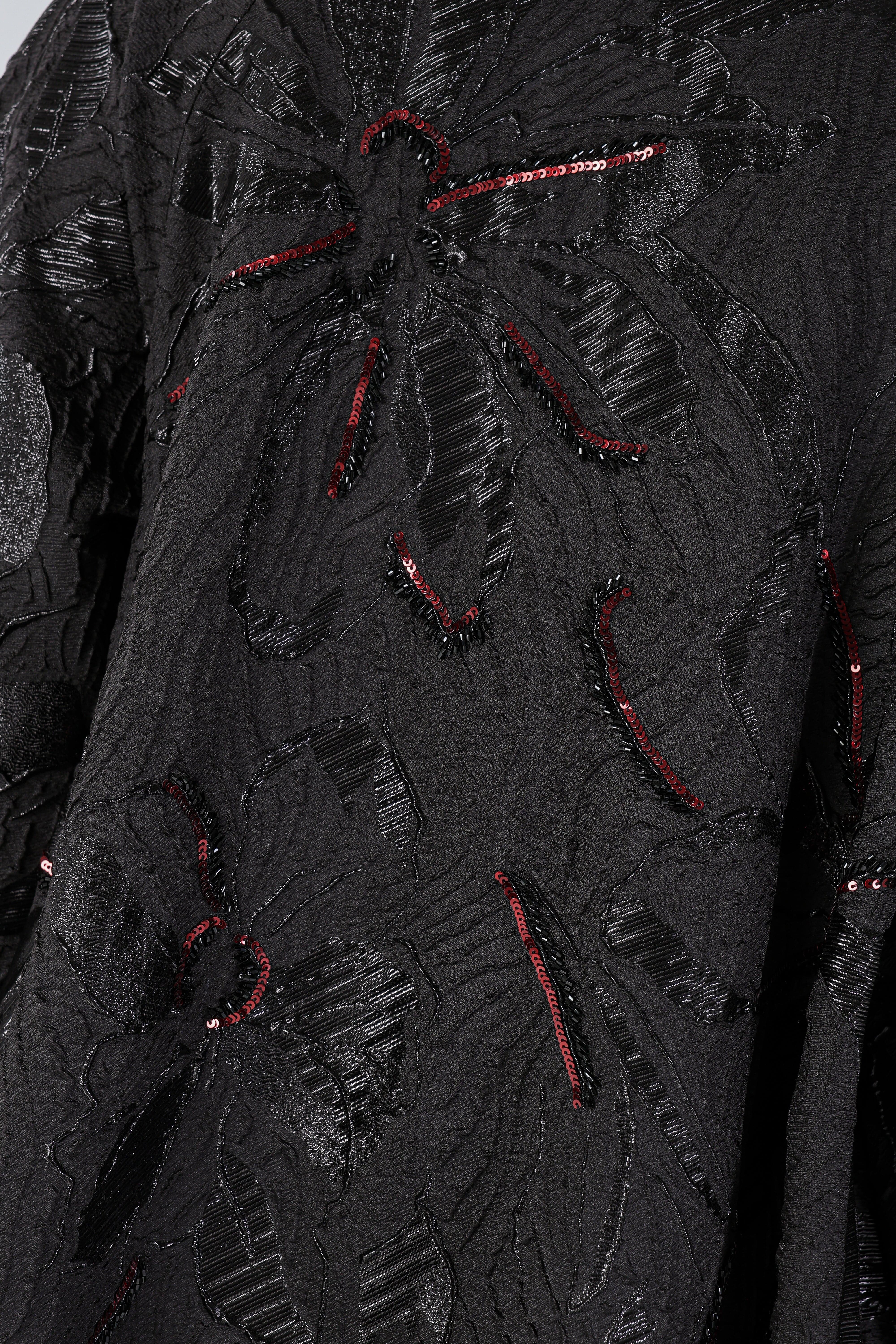 Hand embroidered Metallic Flower design on Black Flower Brocade material.