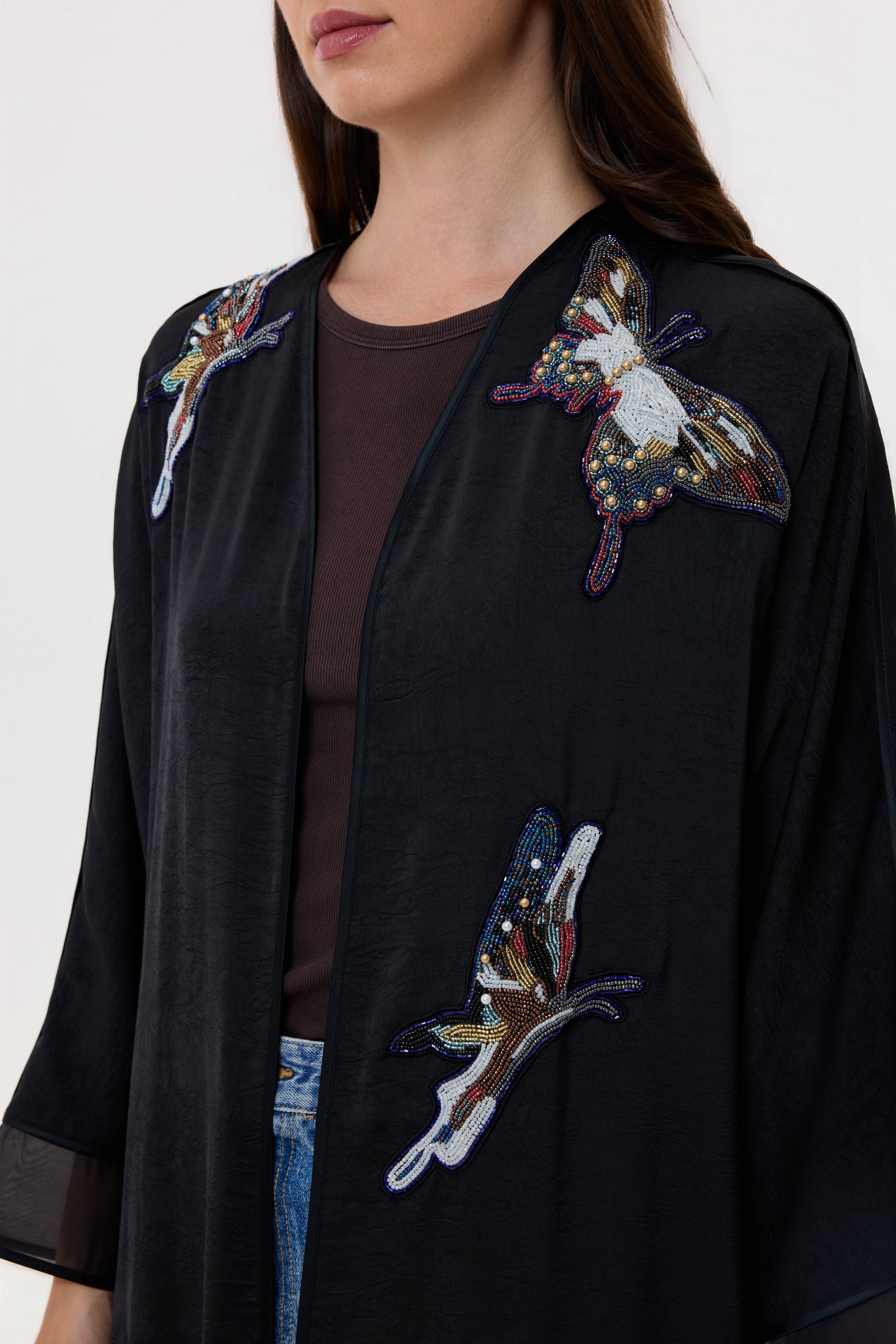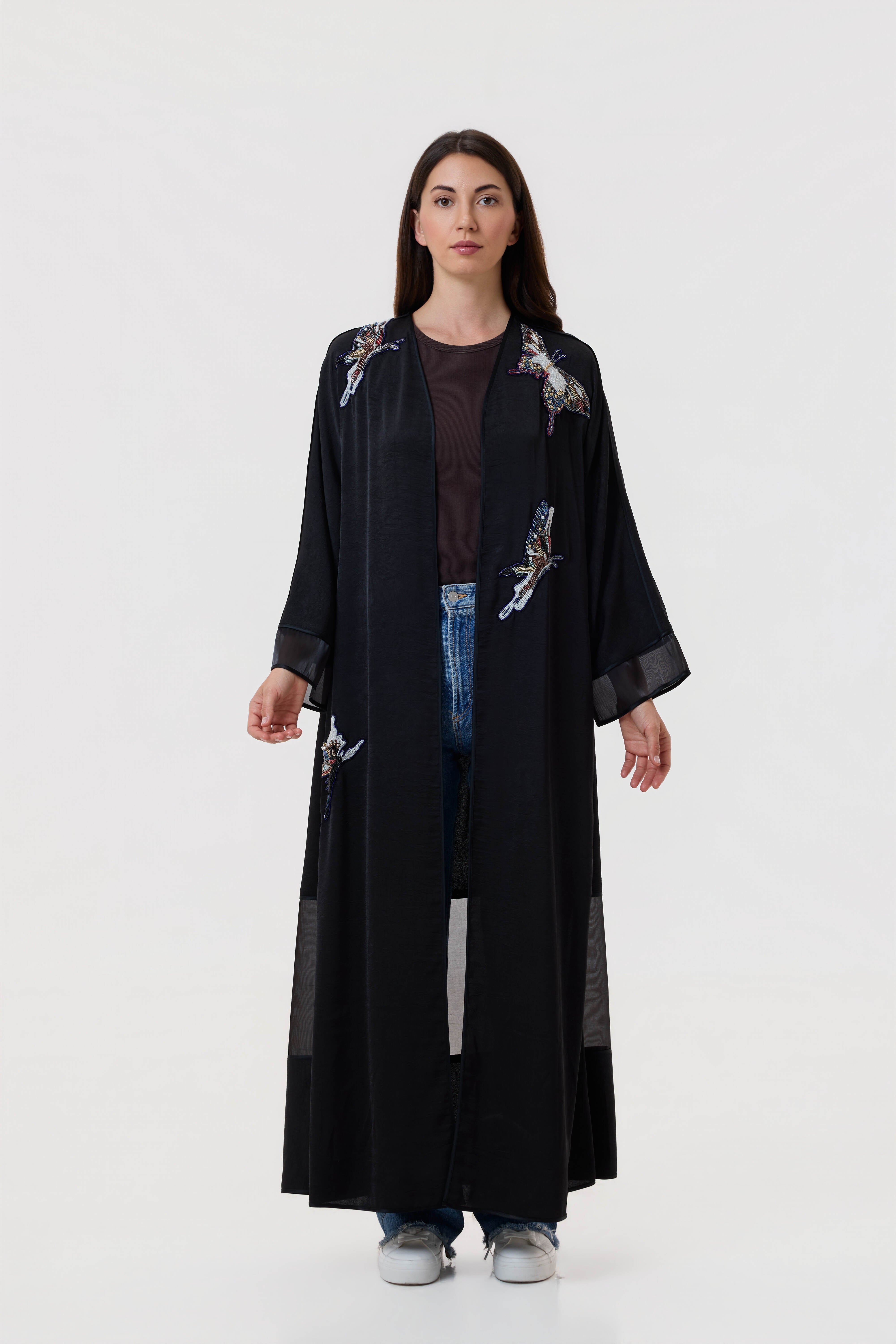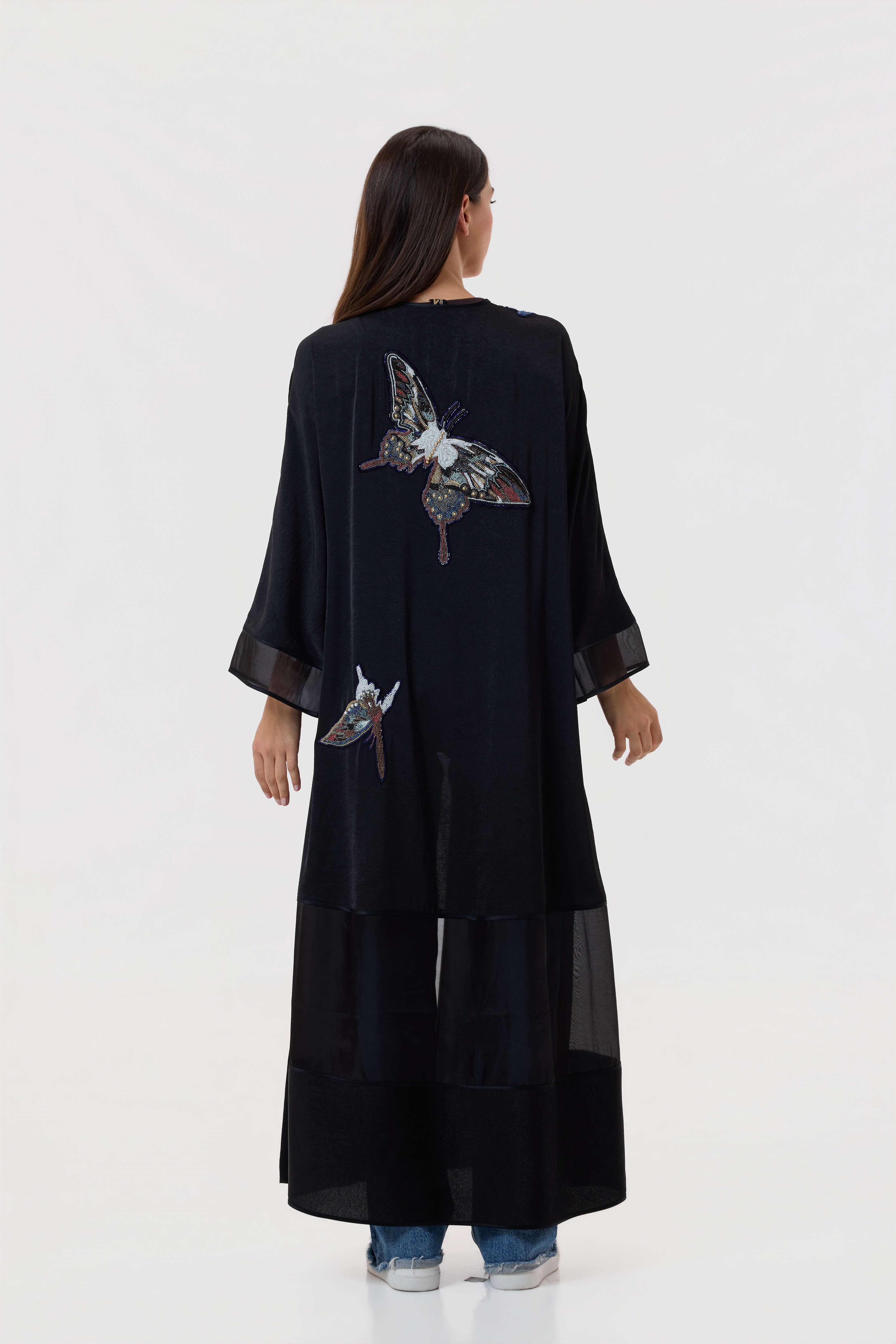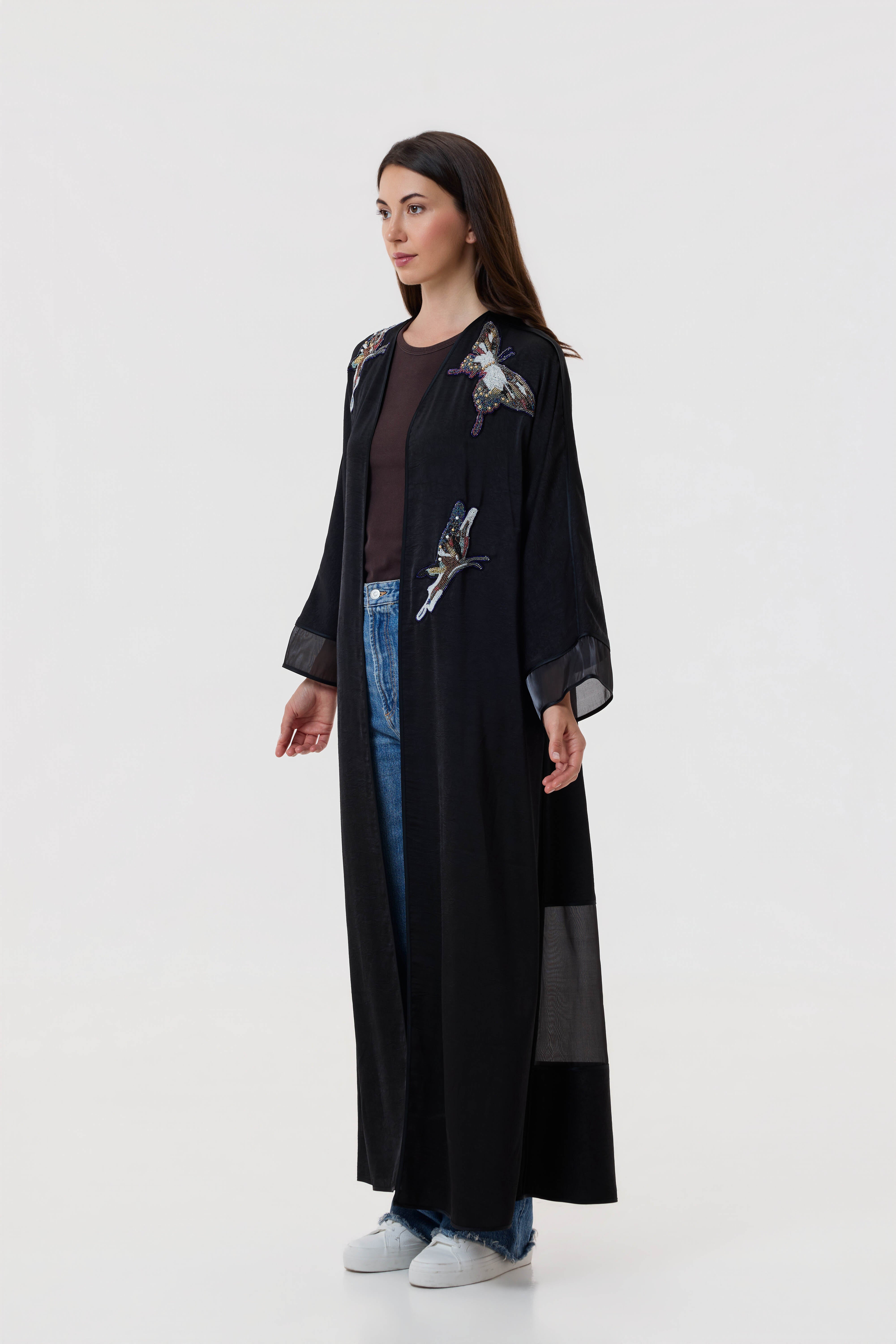 A sophisticated black crepe abaya accented with sheer organza patches and delicate hand-embroidered butterfly details, designed for refined occasion wear.