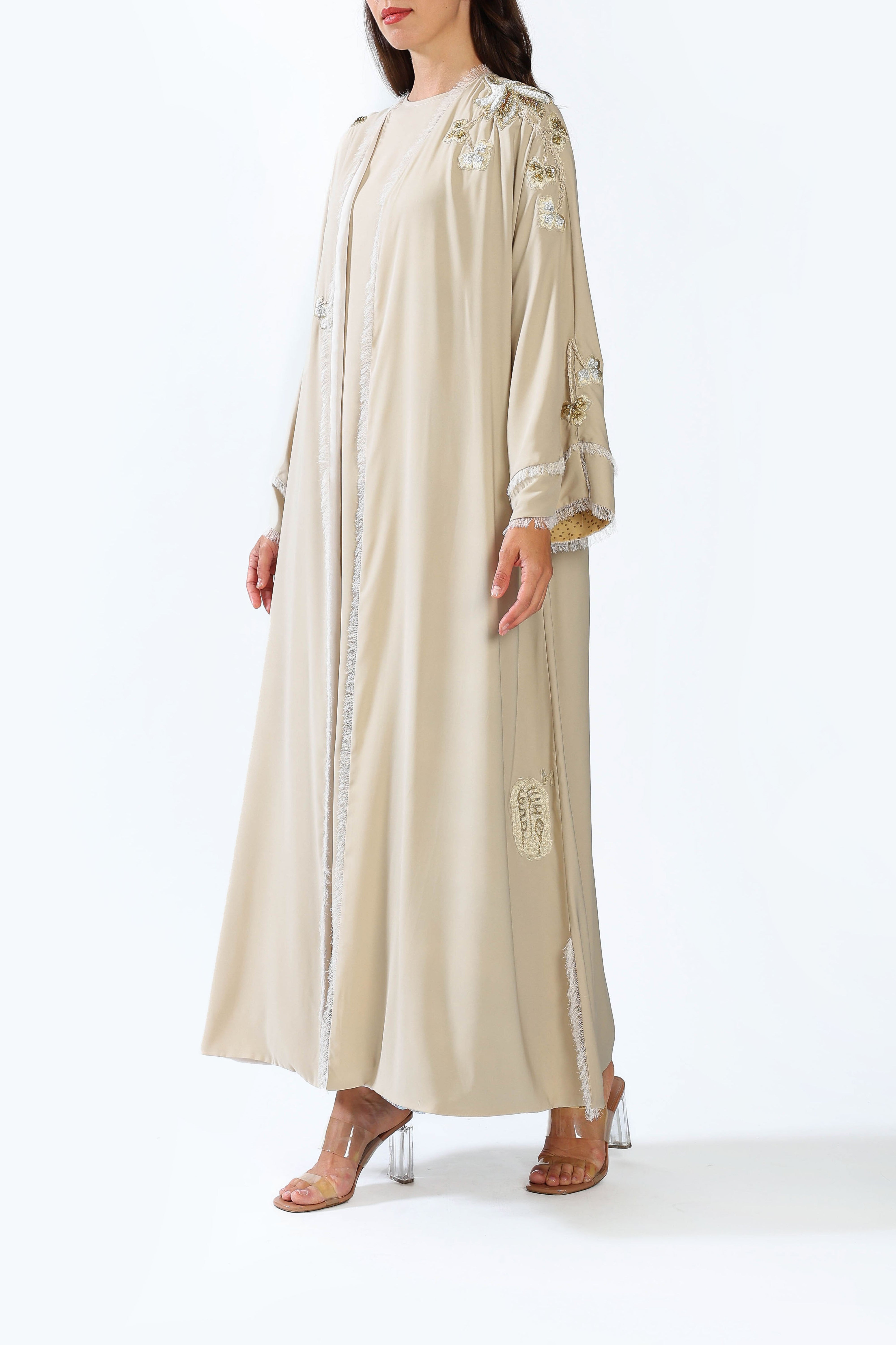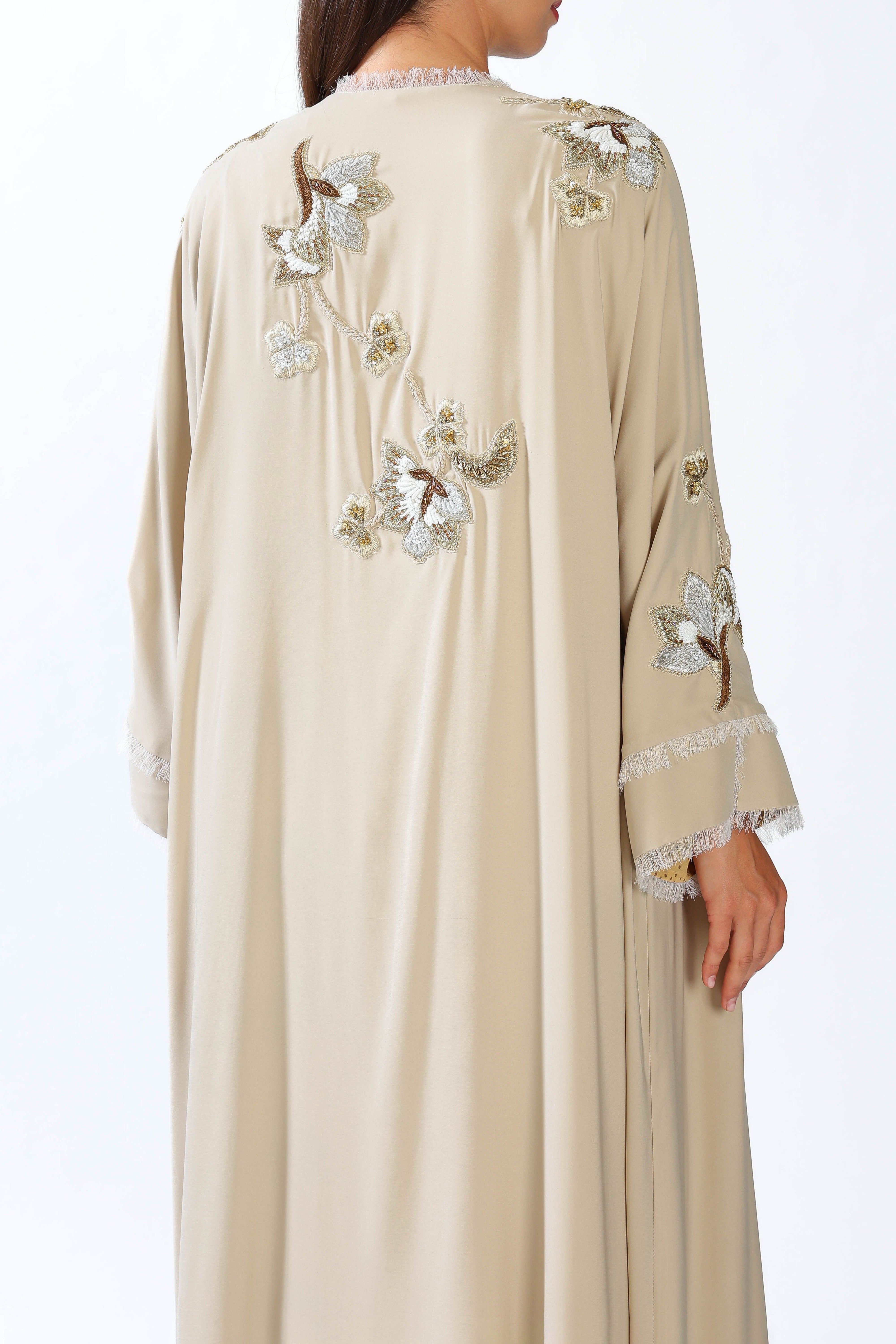 Hand embroidered Scenery design on Beige Armani Silk material.