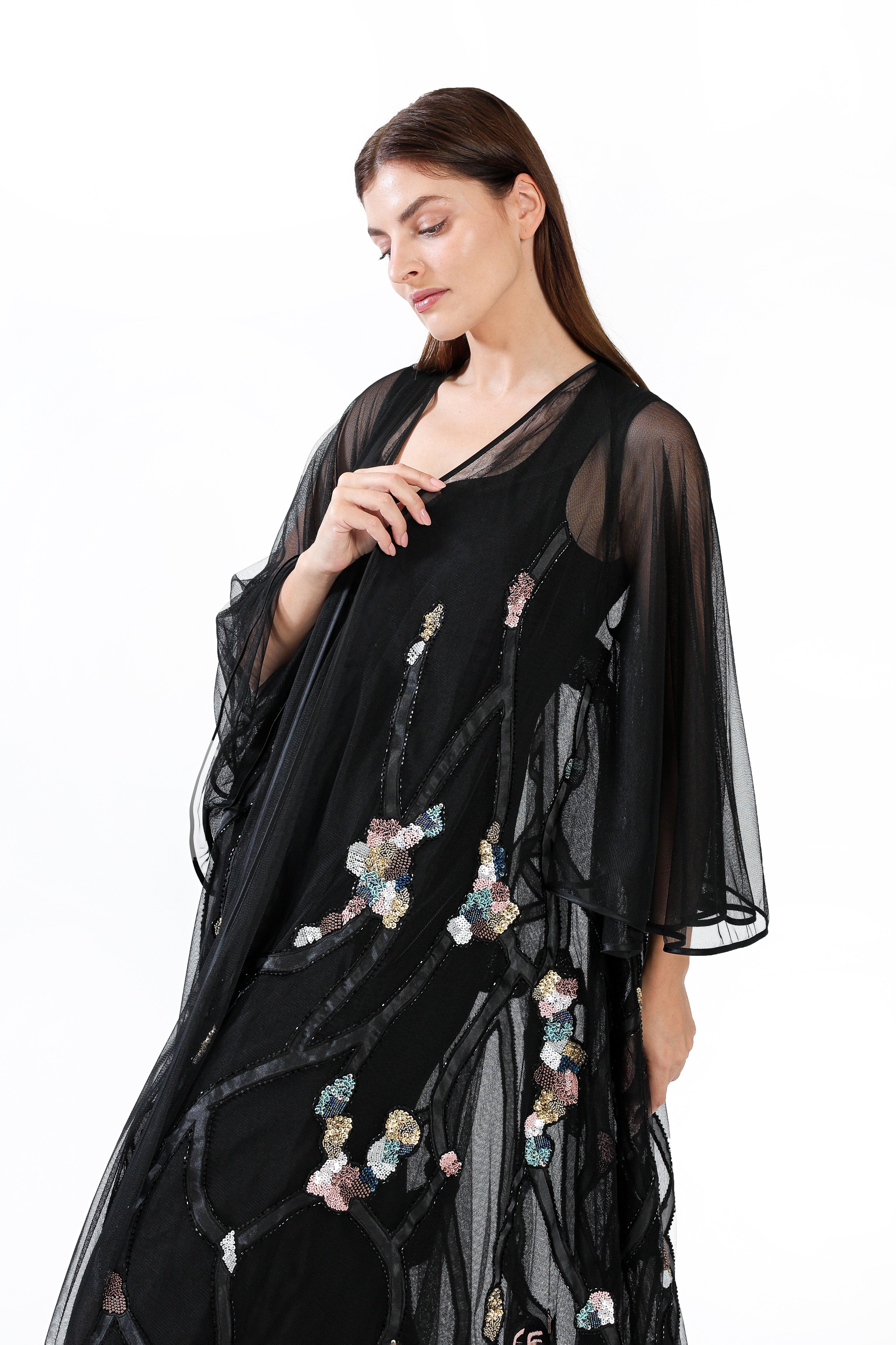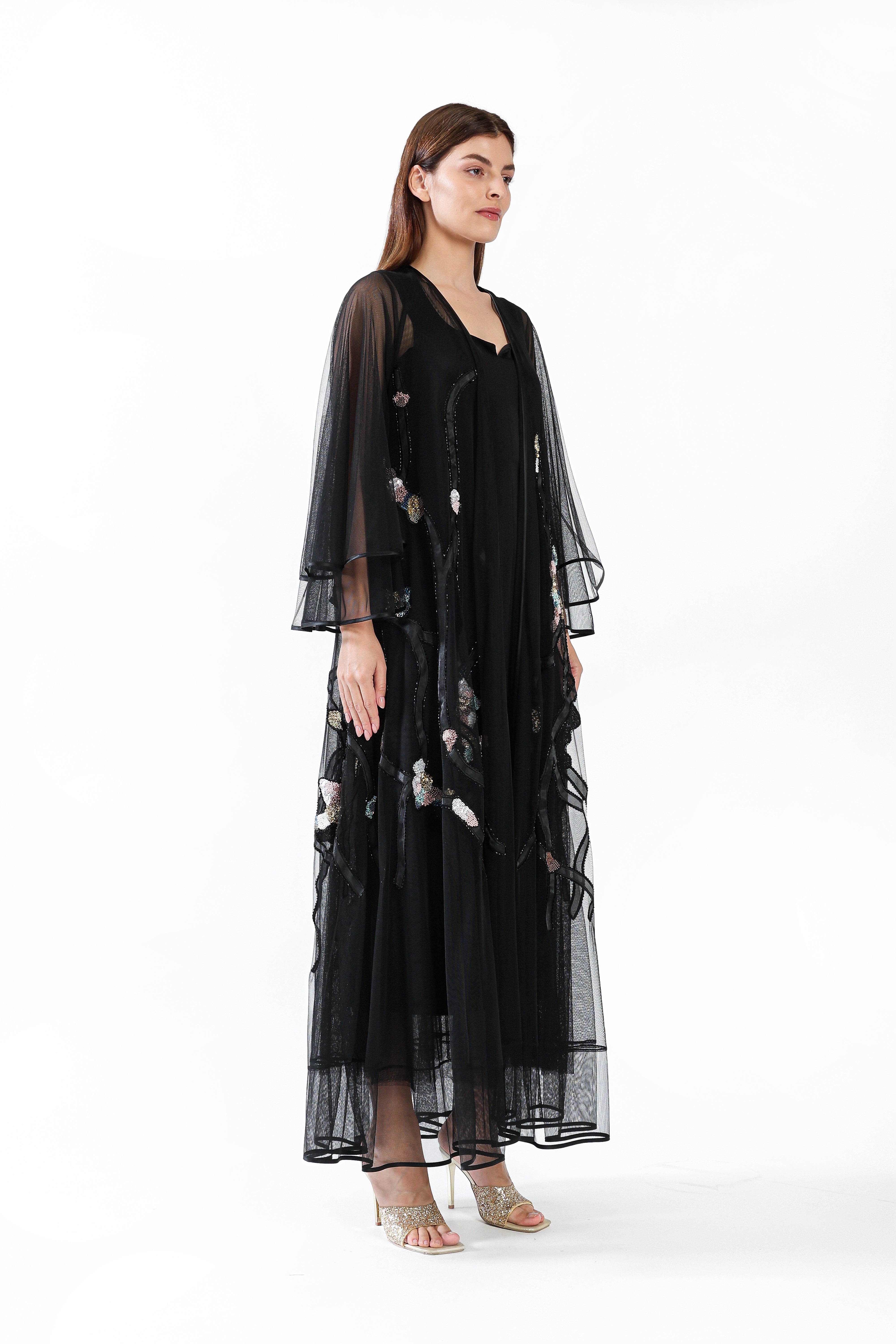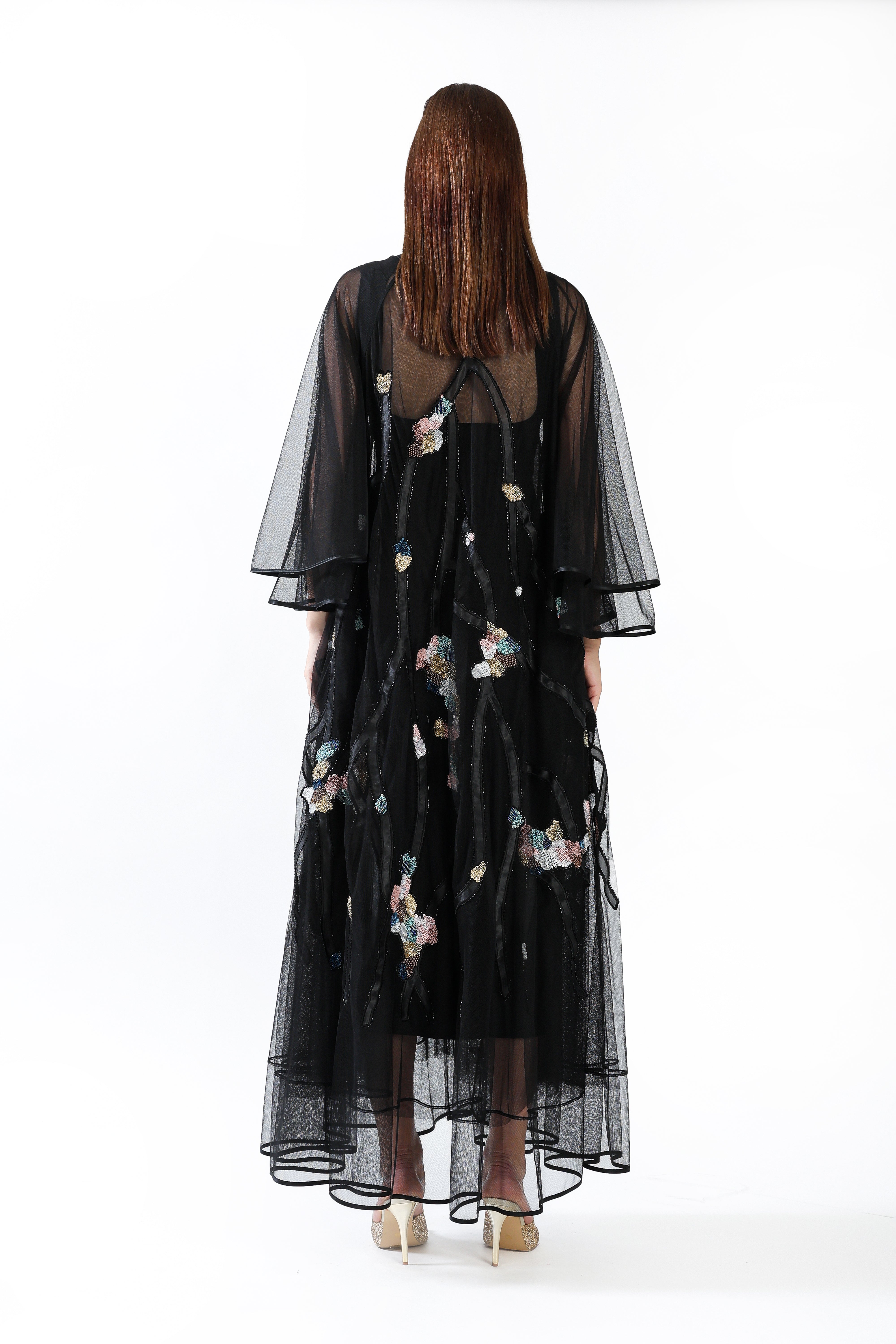 A sheer black tulle design adorned with hand-placed sequins forming delicate blossoms along branching patterns, creating a luminous evening silhouette.