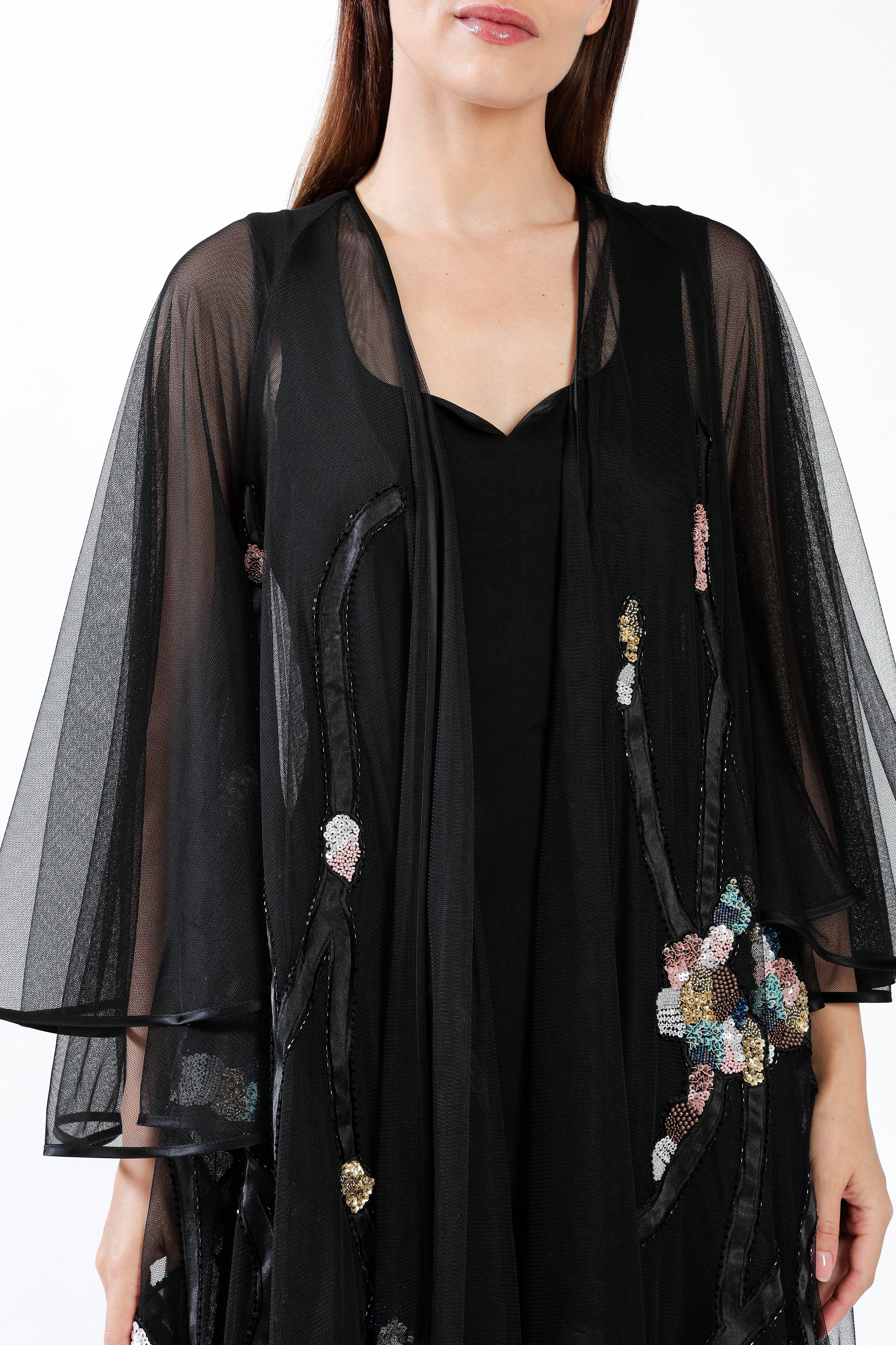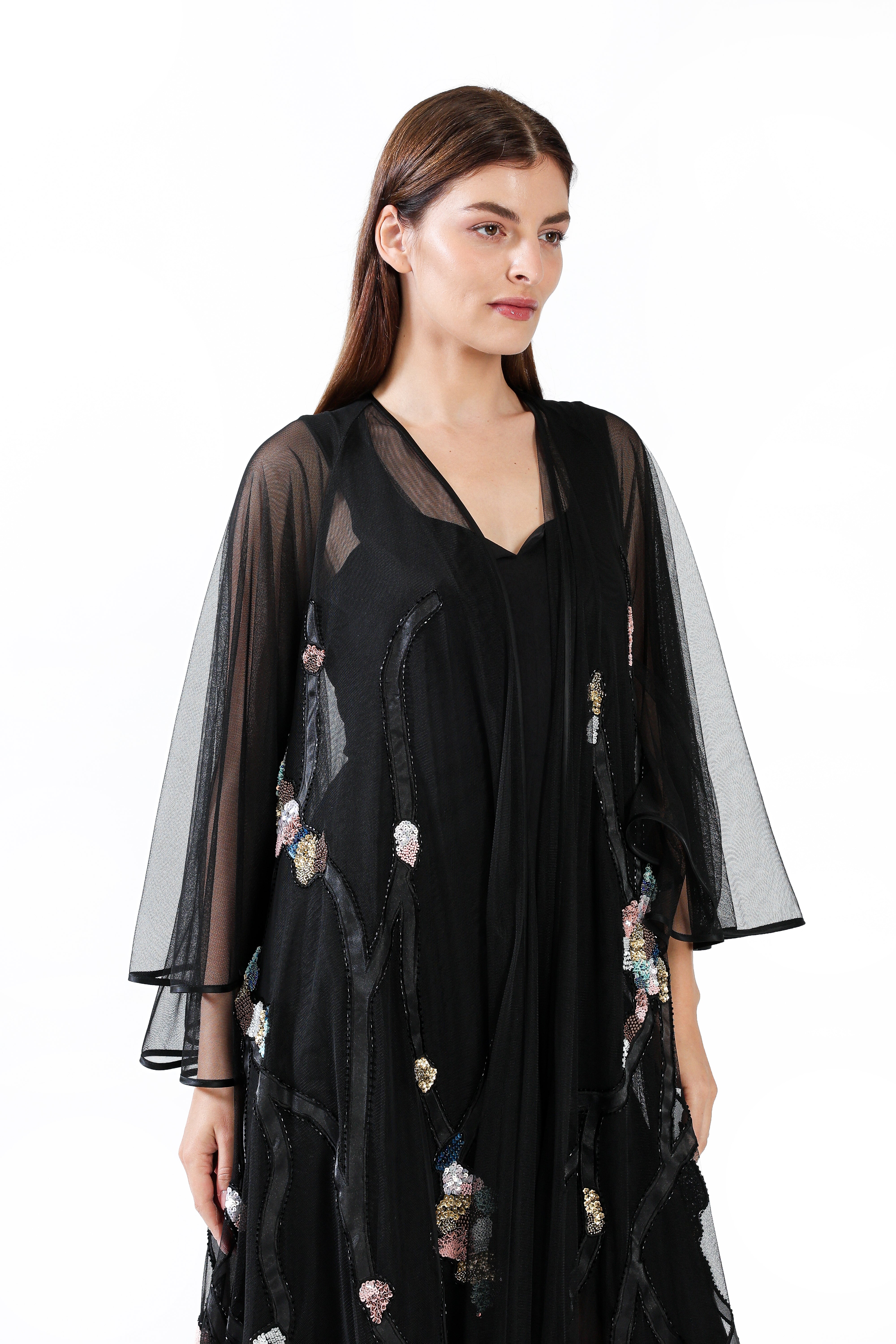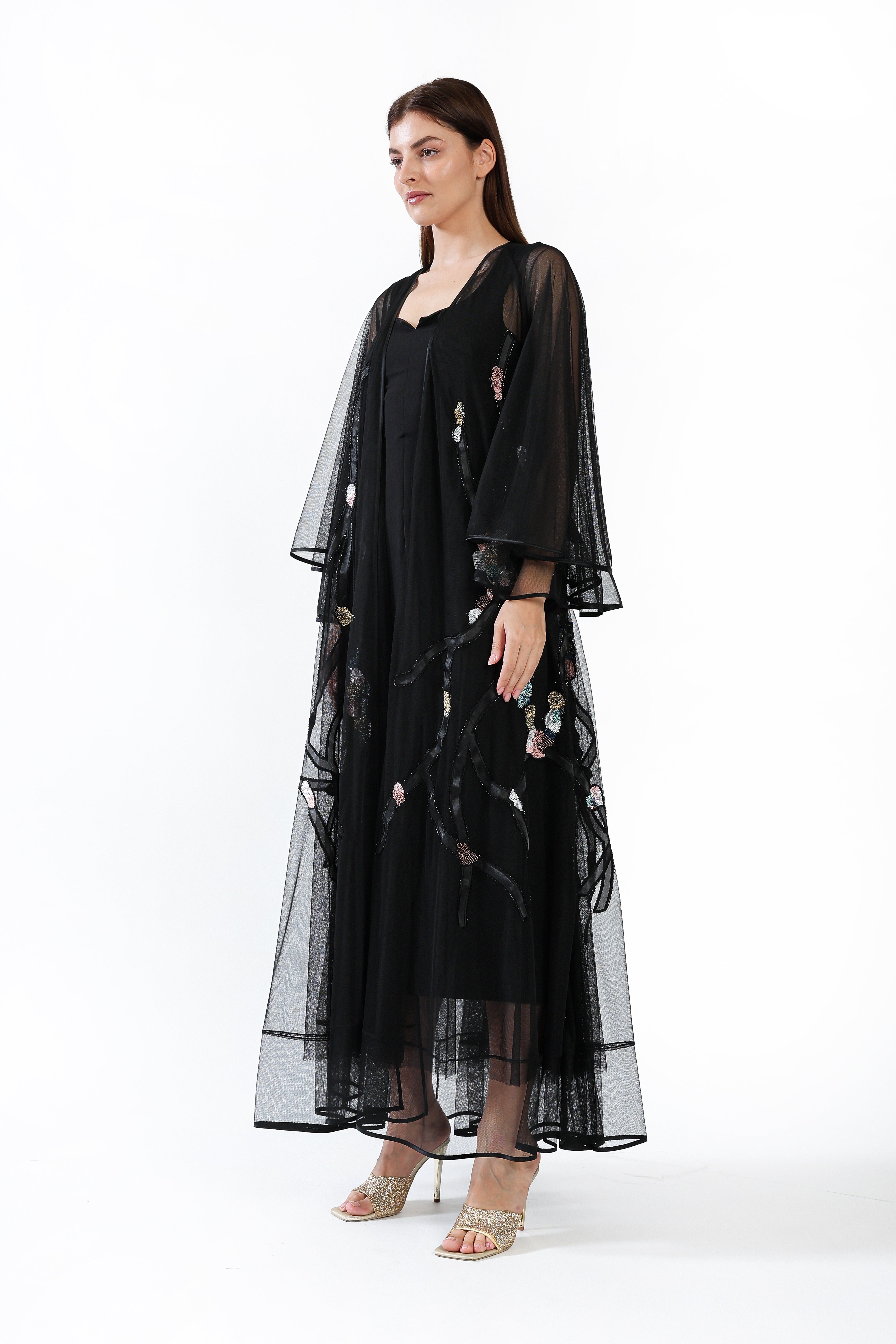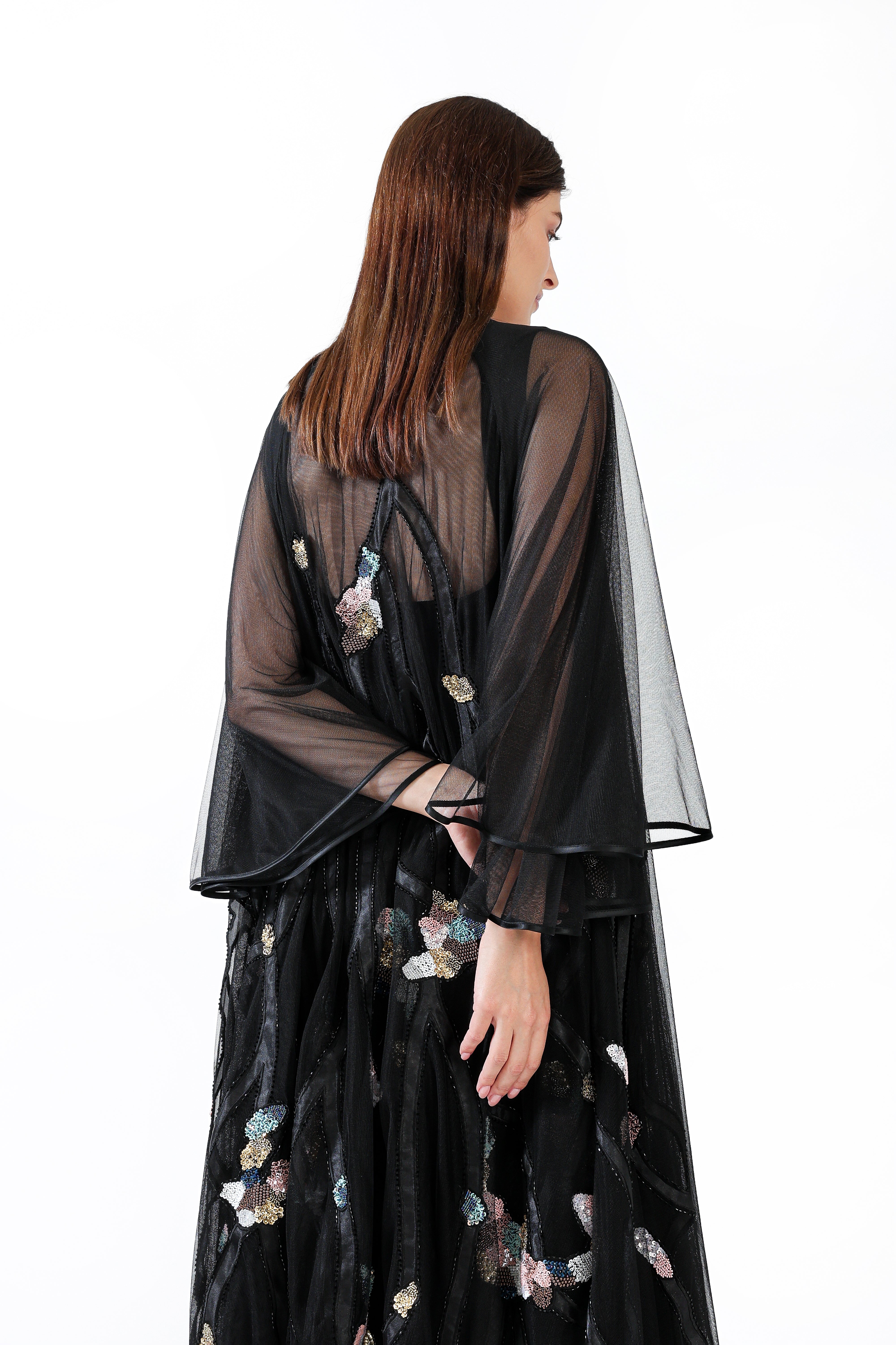 A sheer black tulle design adorned with hand-placed sequins forming delicate blossoms along branching patterns, creating a luminous evening silhouette.
